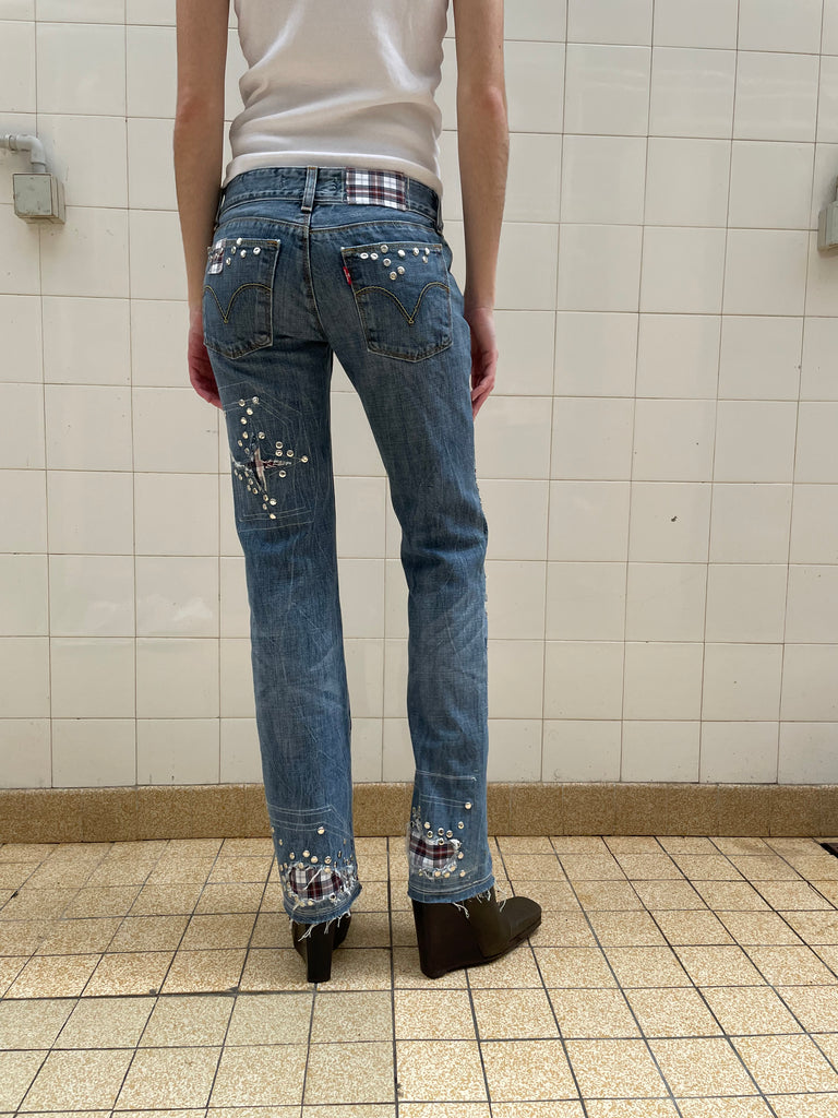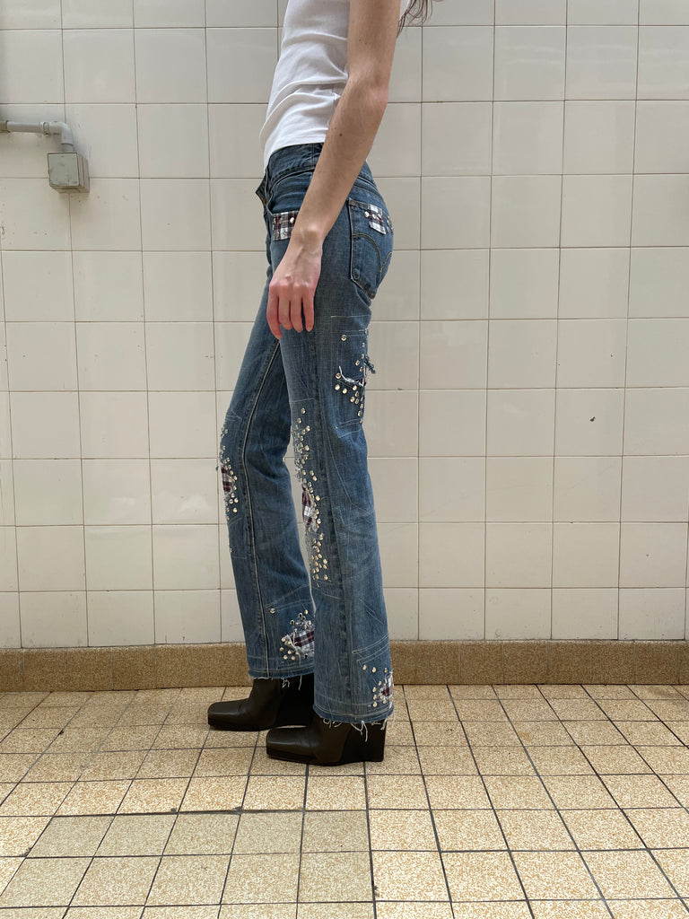 One of one Up-cycled vintage denim jeans with cotton plaid shirt patches, distressed knees and studs on front and back. With vintage cotton shirt lining on the inside. Designed and made in Paris.