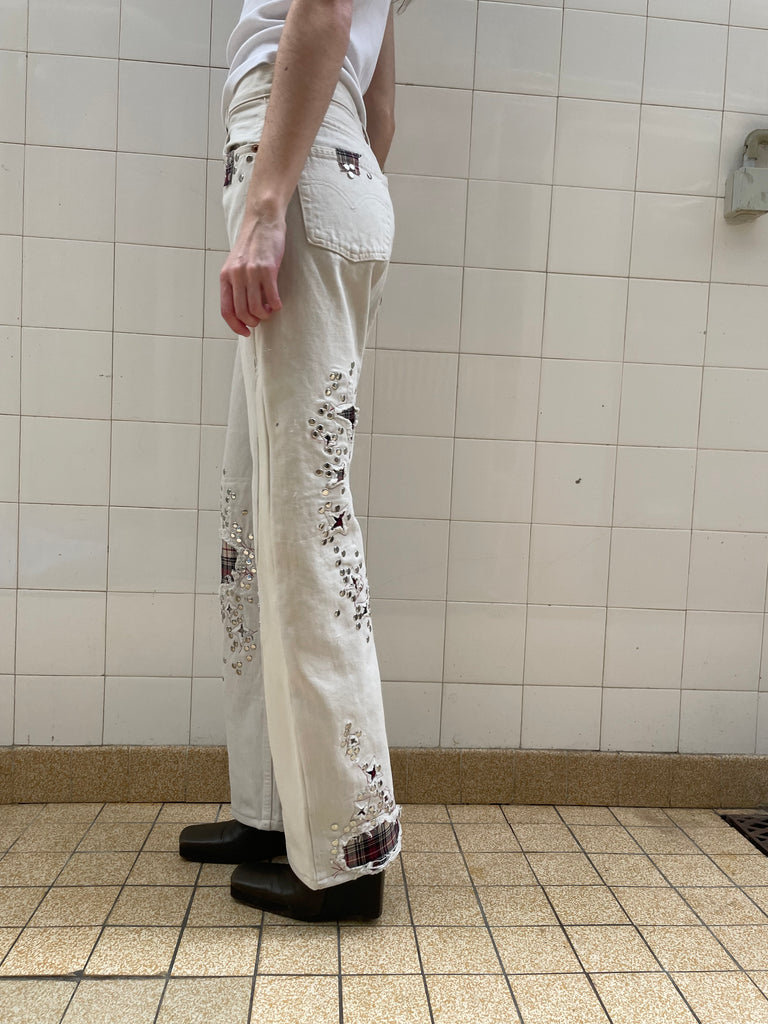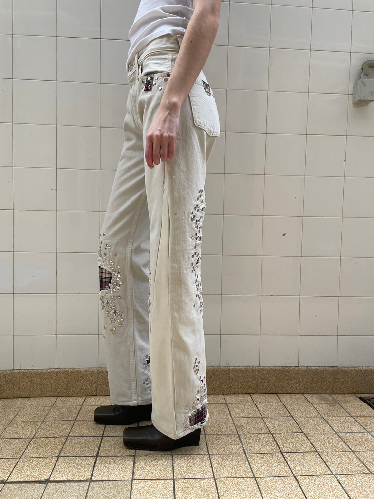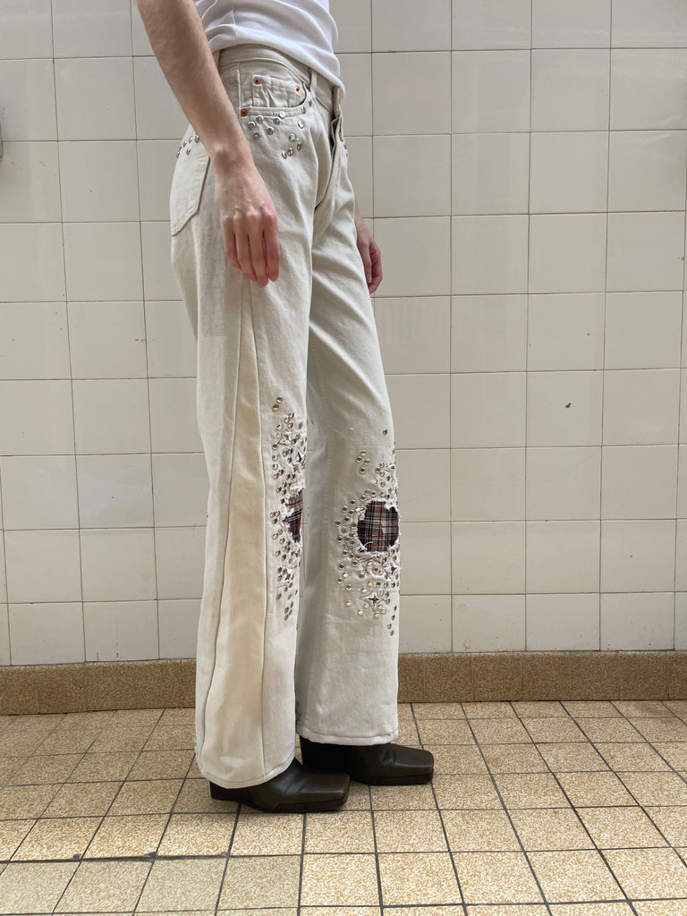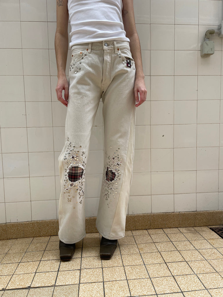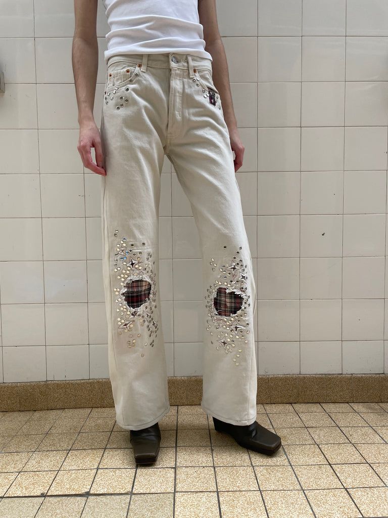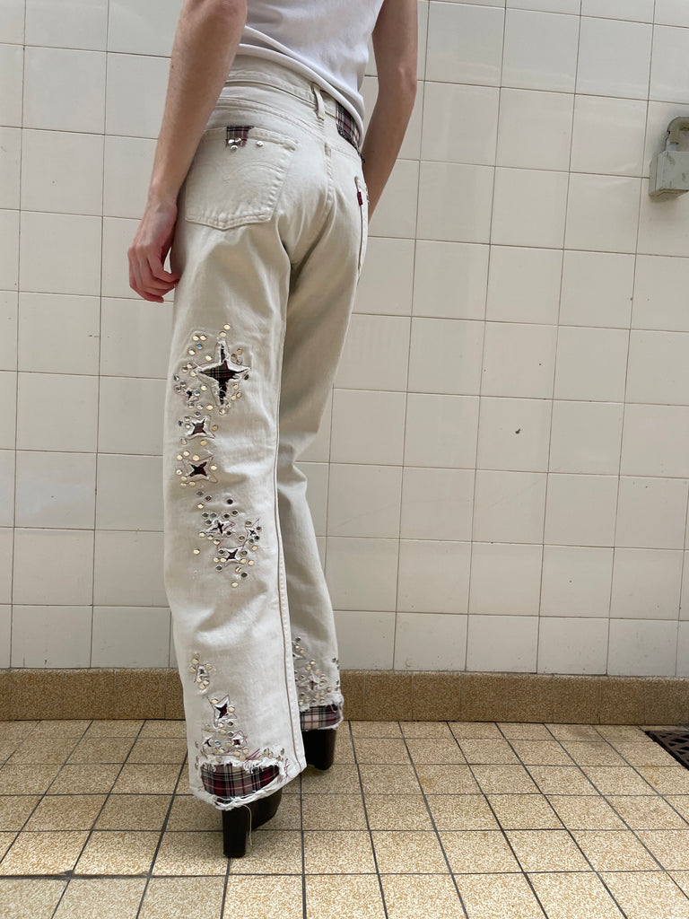 One of one Up-cycled vintage denim jeans with cotton shirt plaid patches, distressed knees and studs on front and back. featuring lots of cross stars around knees and falling down the back of the leg. inspired by Schillers falling stars ring.