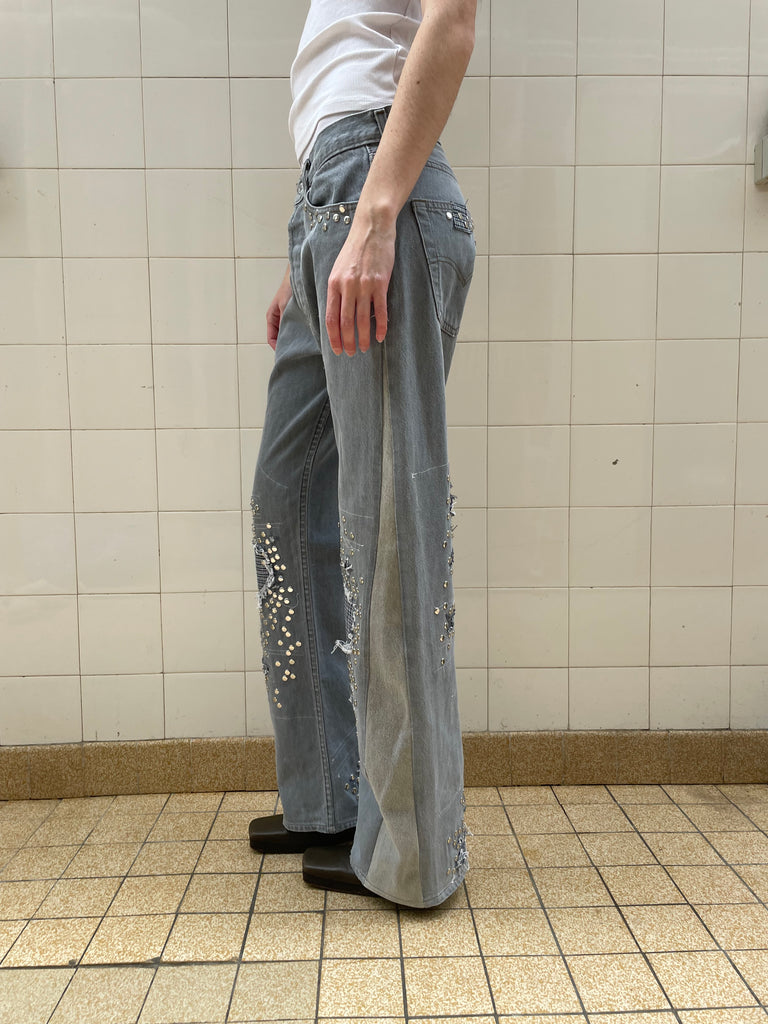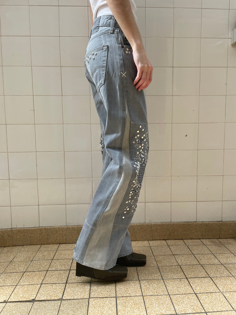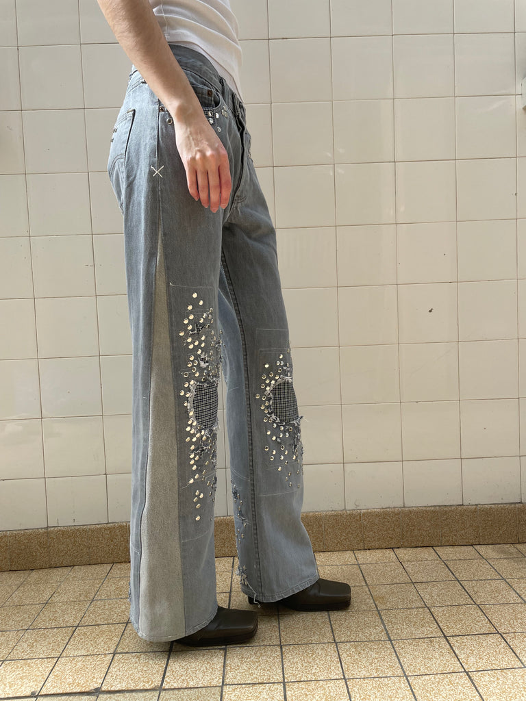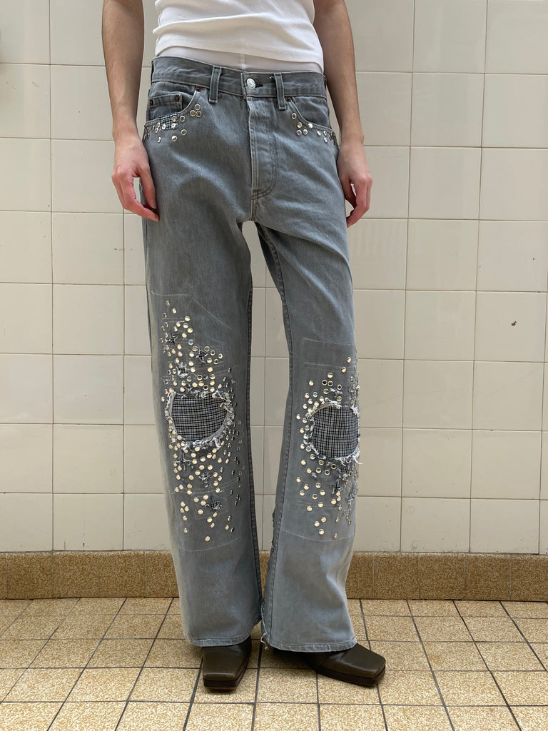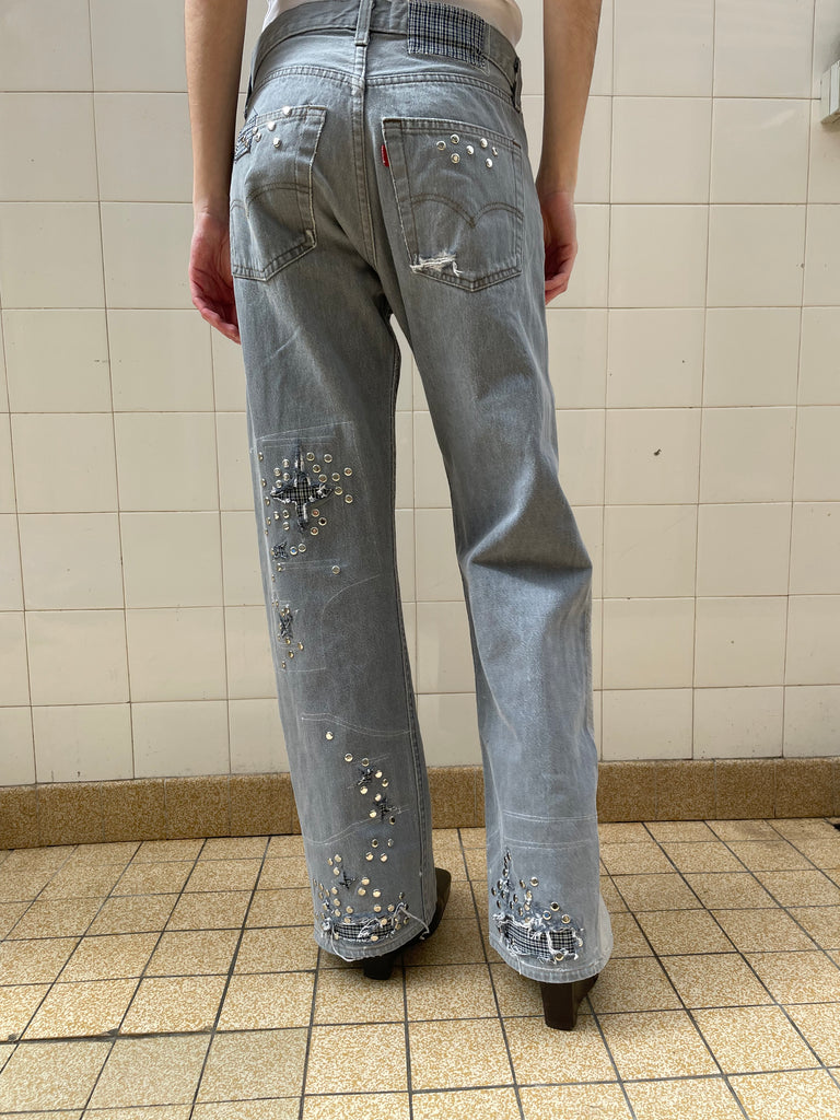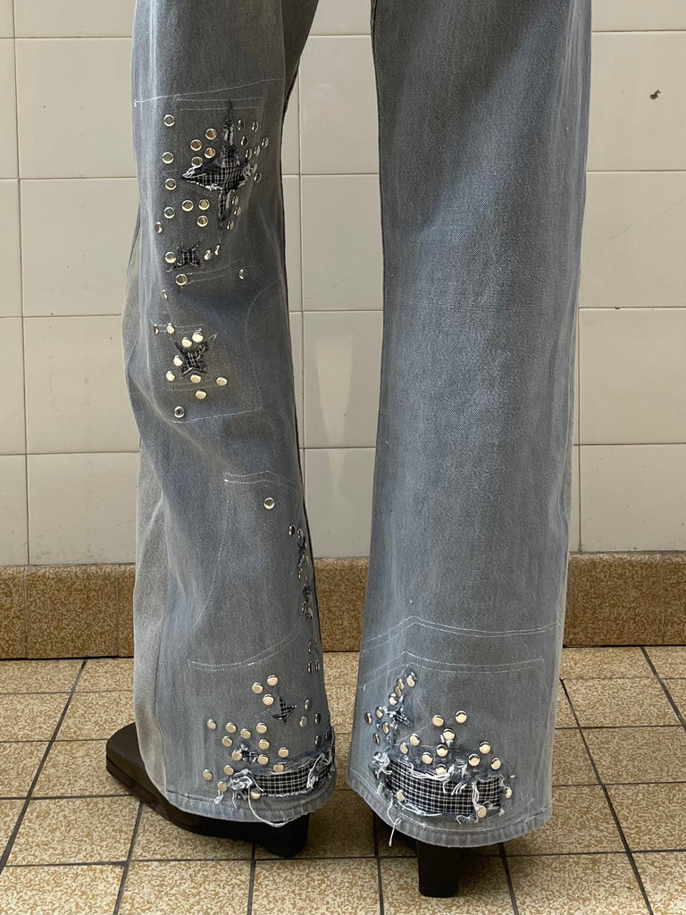 One of one Up-cycled vintage denim jeans with cotton shirt plaid patches, distressed knees and studs on front and back. featuring lots of cross stars around knees and falling down the back of the leg. inspired by Schillers falling stars ring.