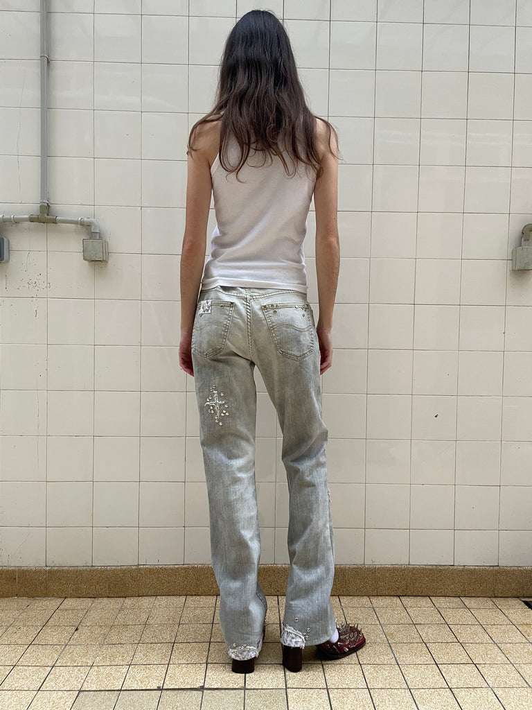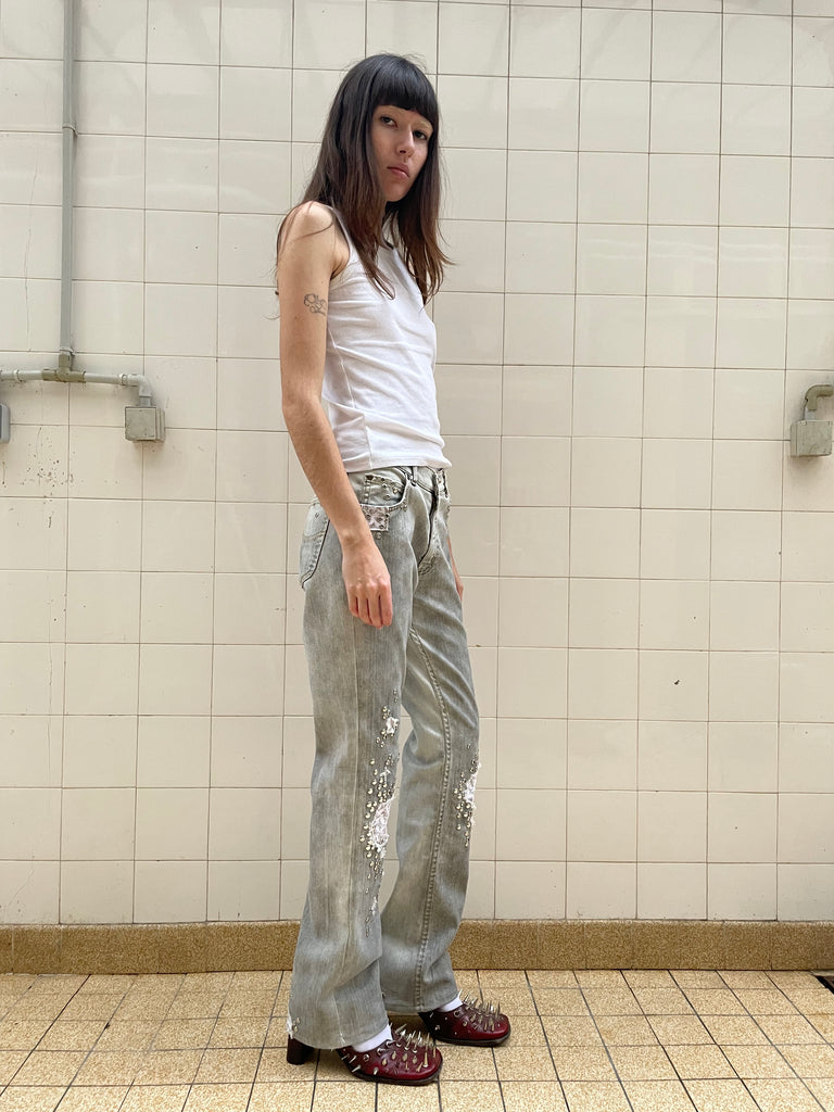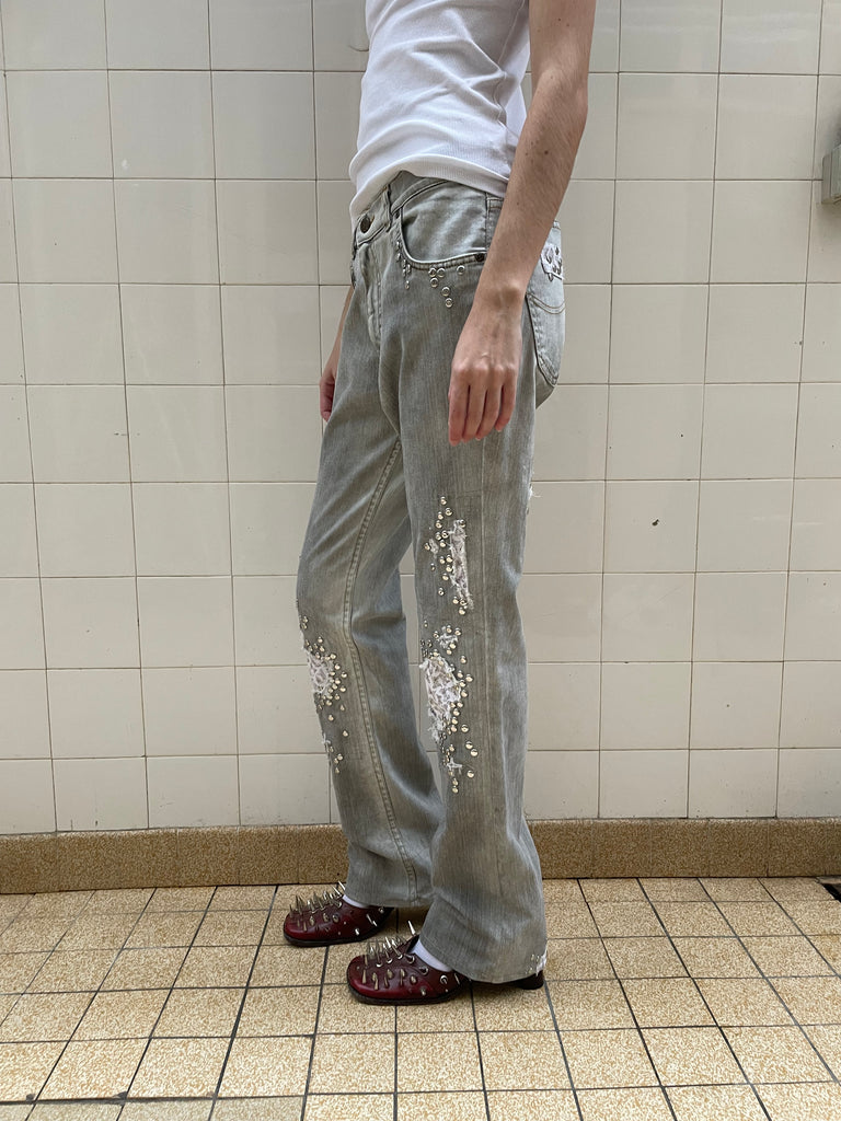 One of one up-cycled studded jeans with distressed details and vintage butterfly cotton inserts. Unisex