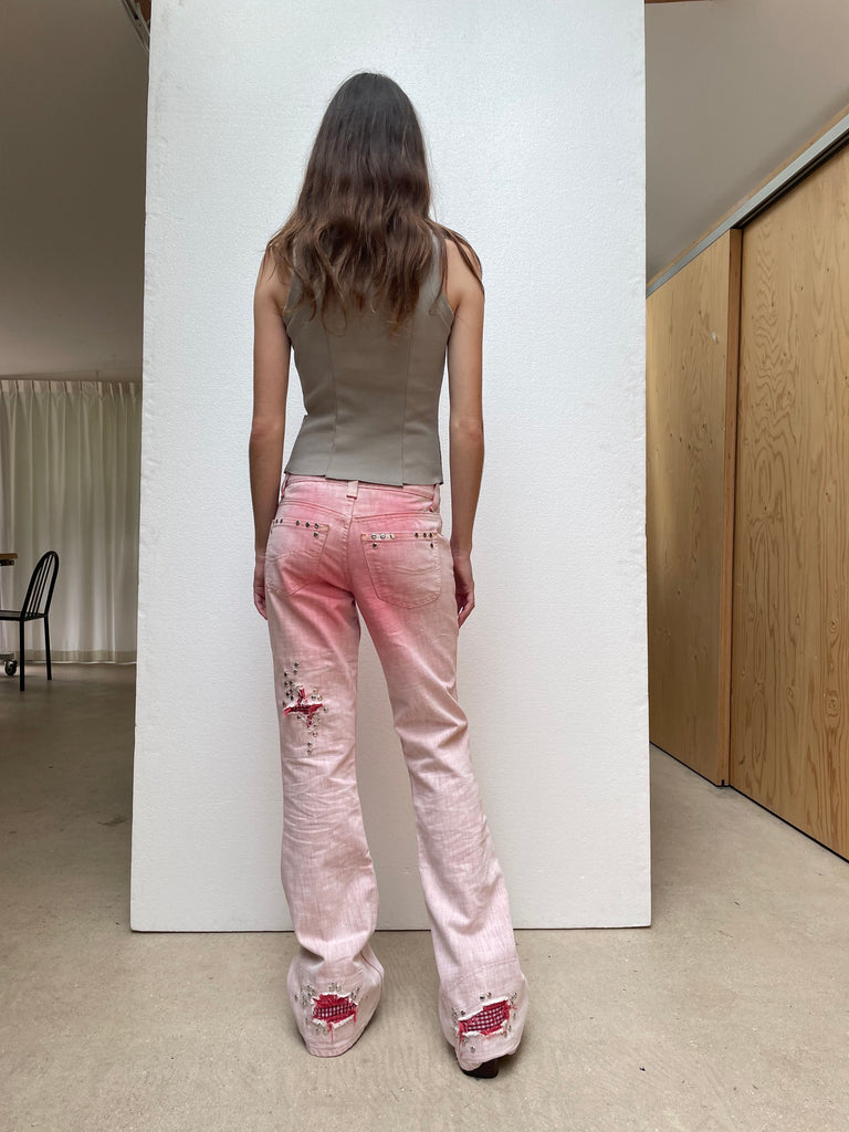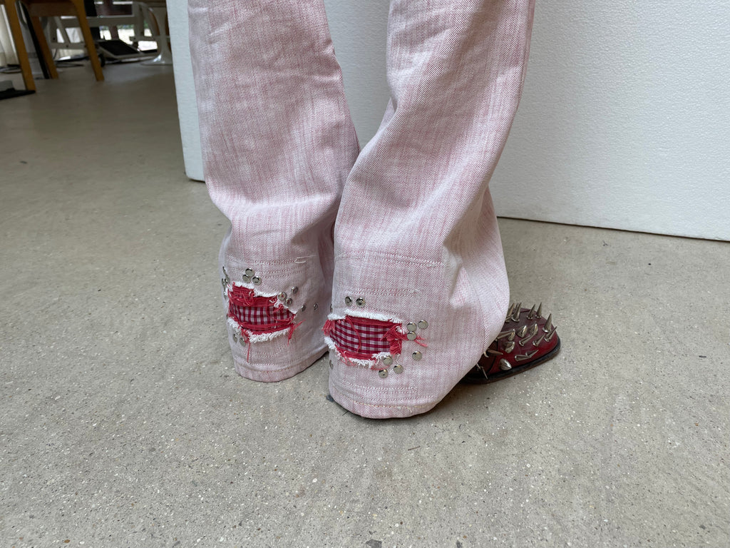 One of one up-cycled studded jeans with distressed details and plaid cotton shirt inserts.