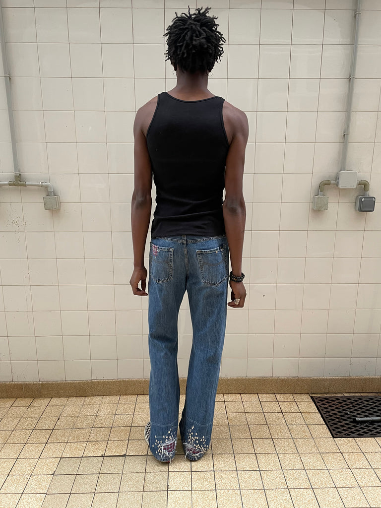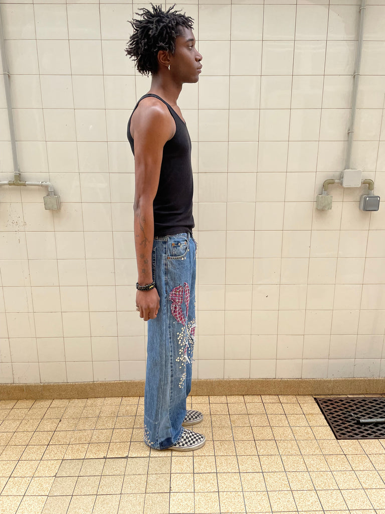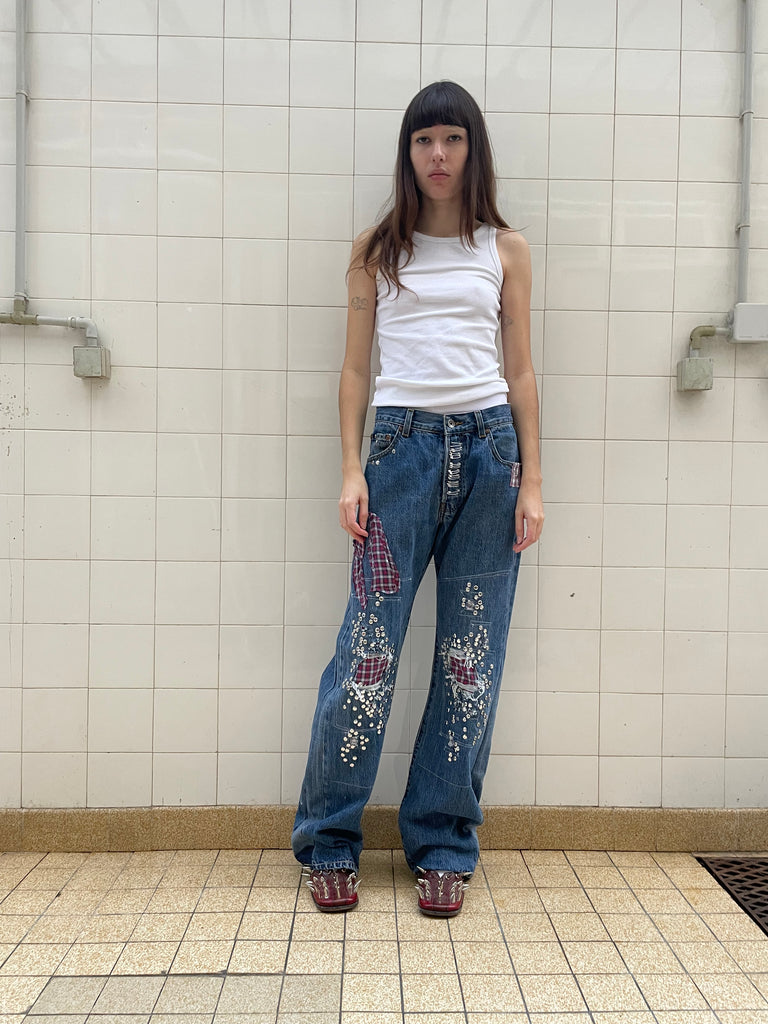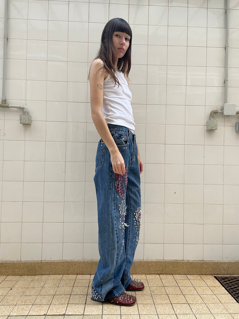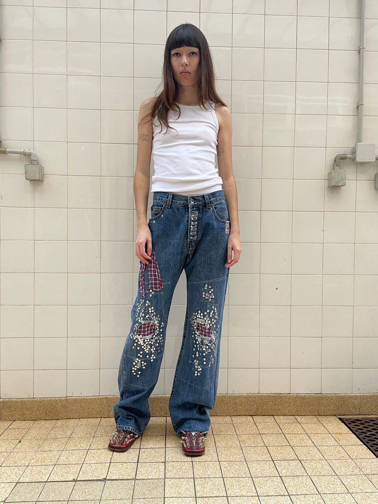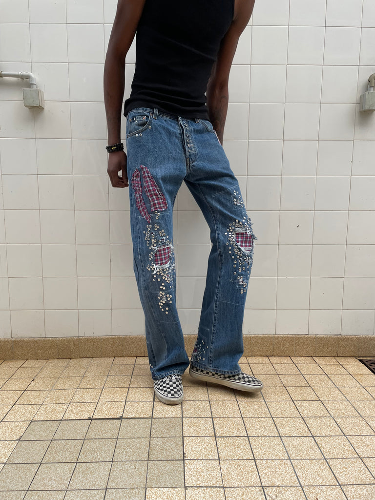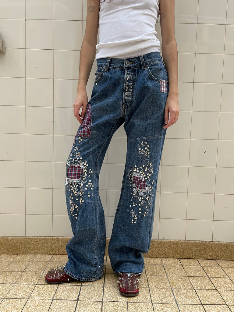 One of one up-cycled studded jeans with distressed details and vintage plaid cotton inserts. Unisex