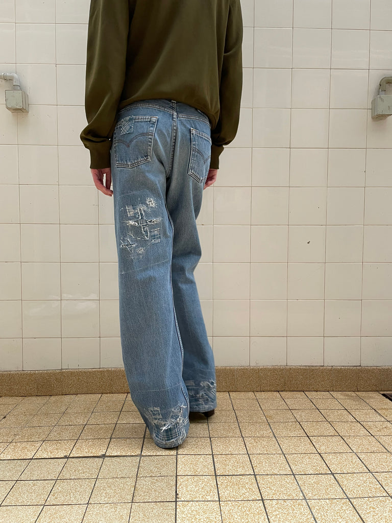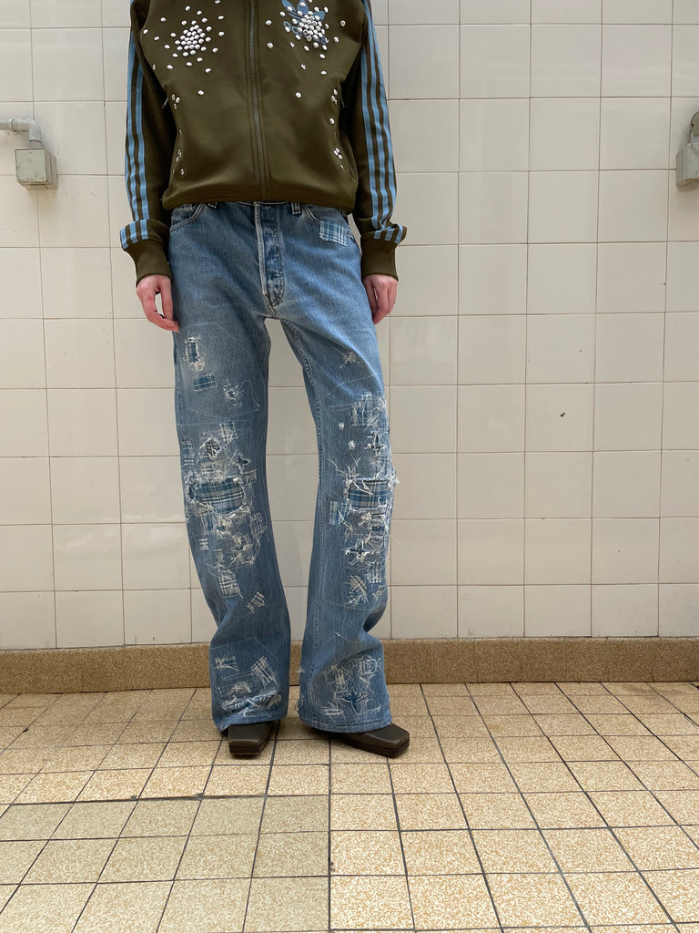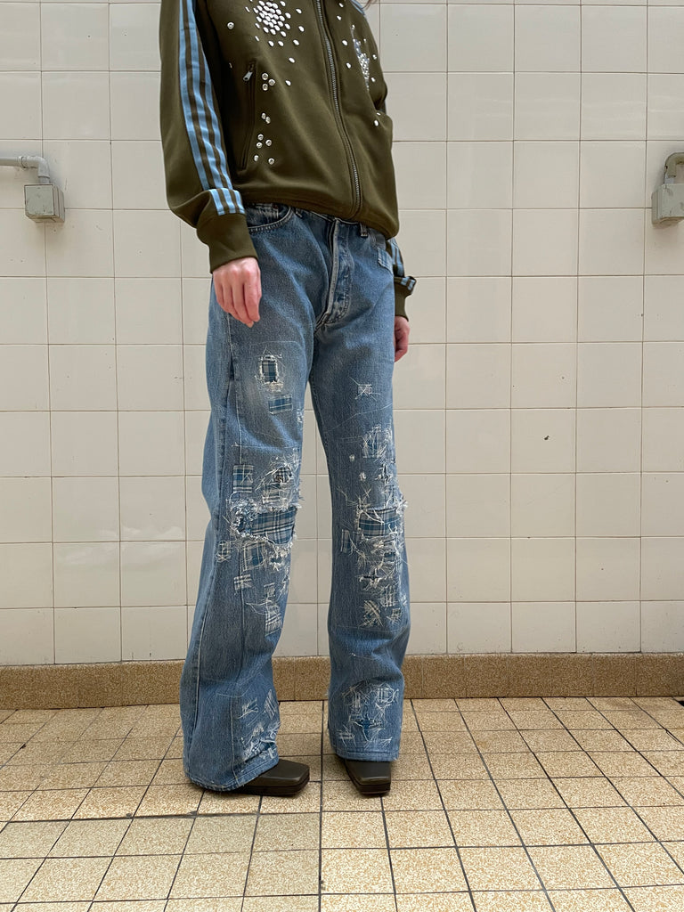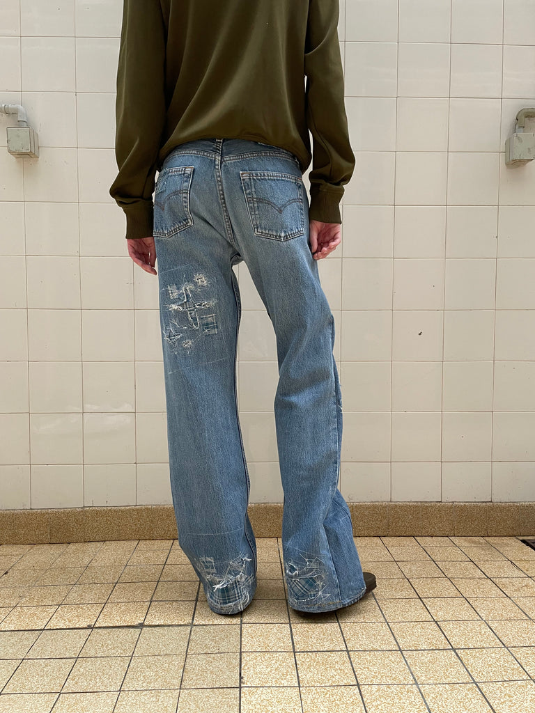 one of one Up-cycled vintage denim jeans with cotton shirt patches, distressed knees and ‘scribble’ stitching details on front and back. Over 5+ hours of sewing time went into these unique jeans. With vintage cotton shirt lining on the inside. Designed and made in Paris.