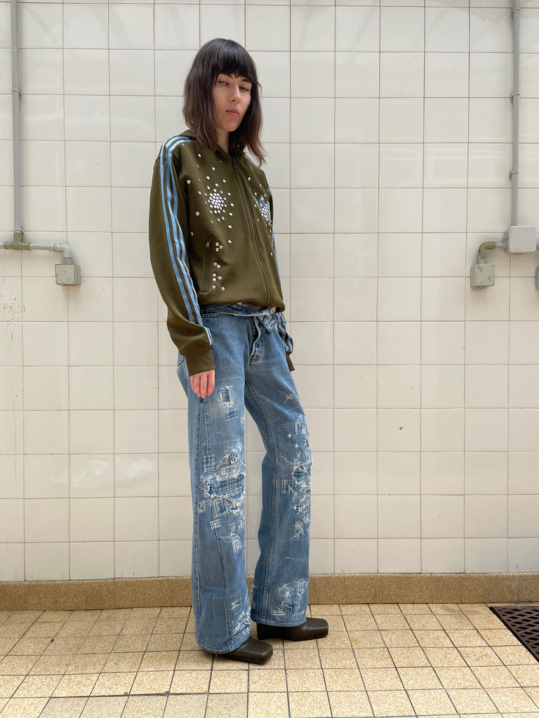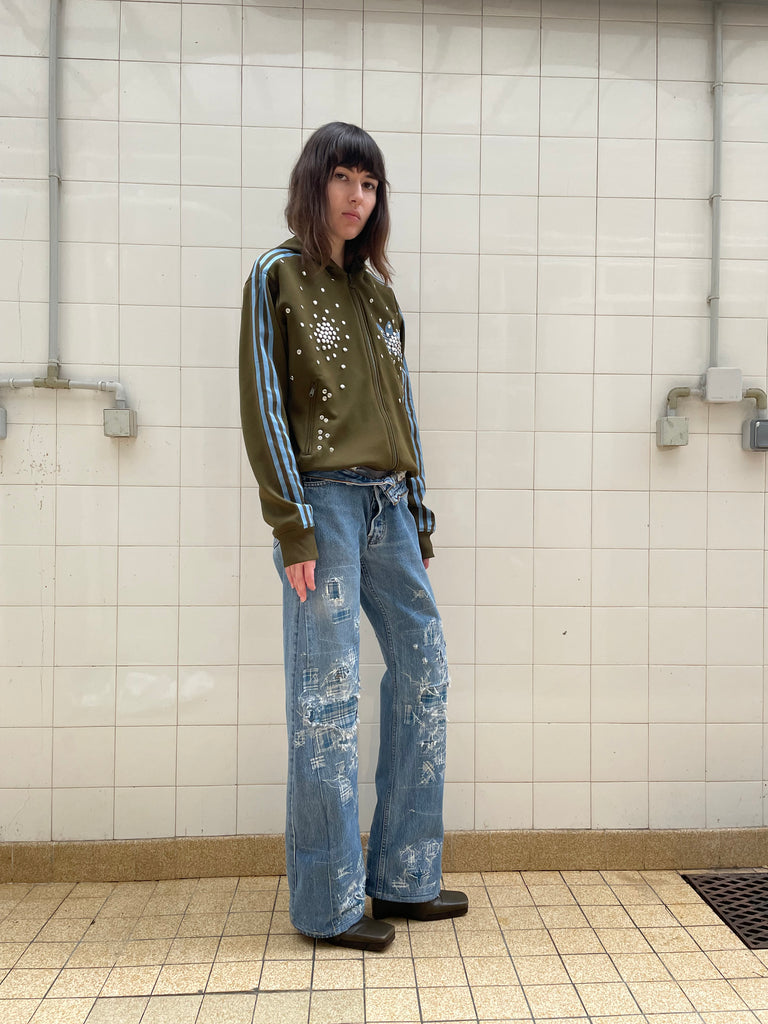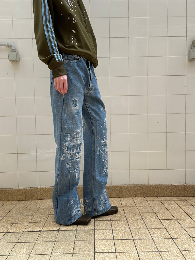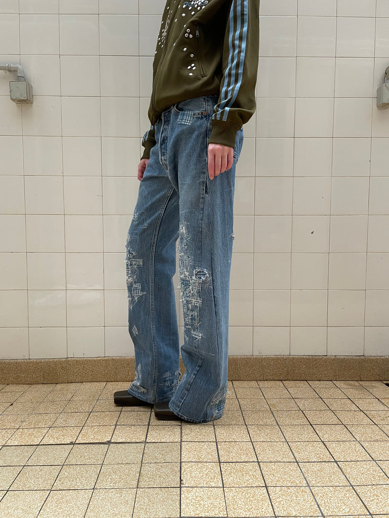 one of one Up-cycled vintage denim jeans with cotton shirt patches, distressed knees and ‘scribble’ stitching details on front and back. Over 5+ hours of sewing time went into these unique jeans. With vintage cotton shirt lining on the inside. Designed and made in Paris.