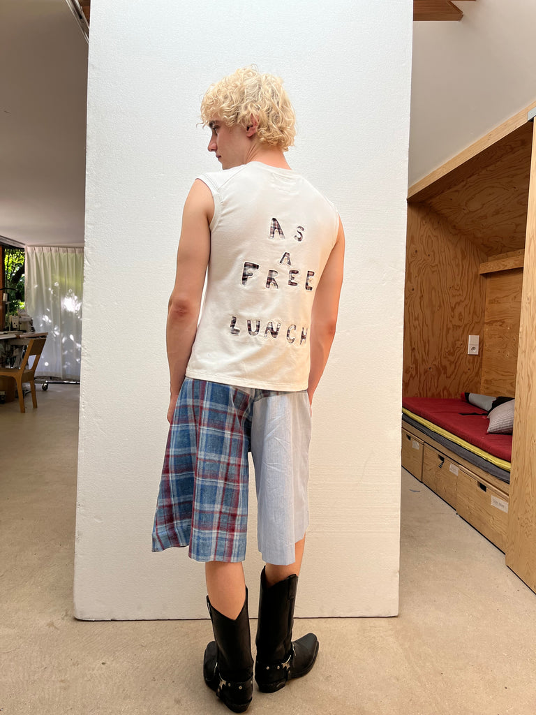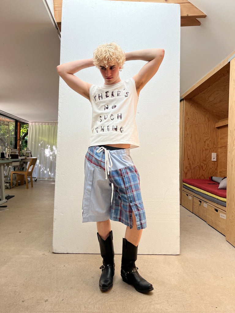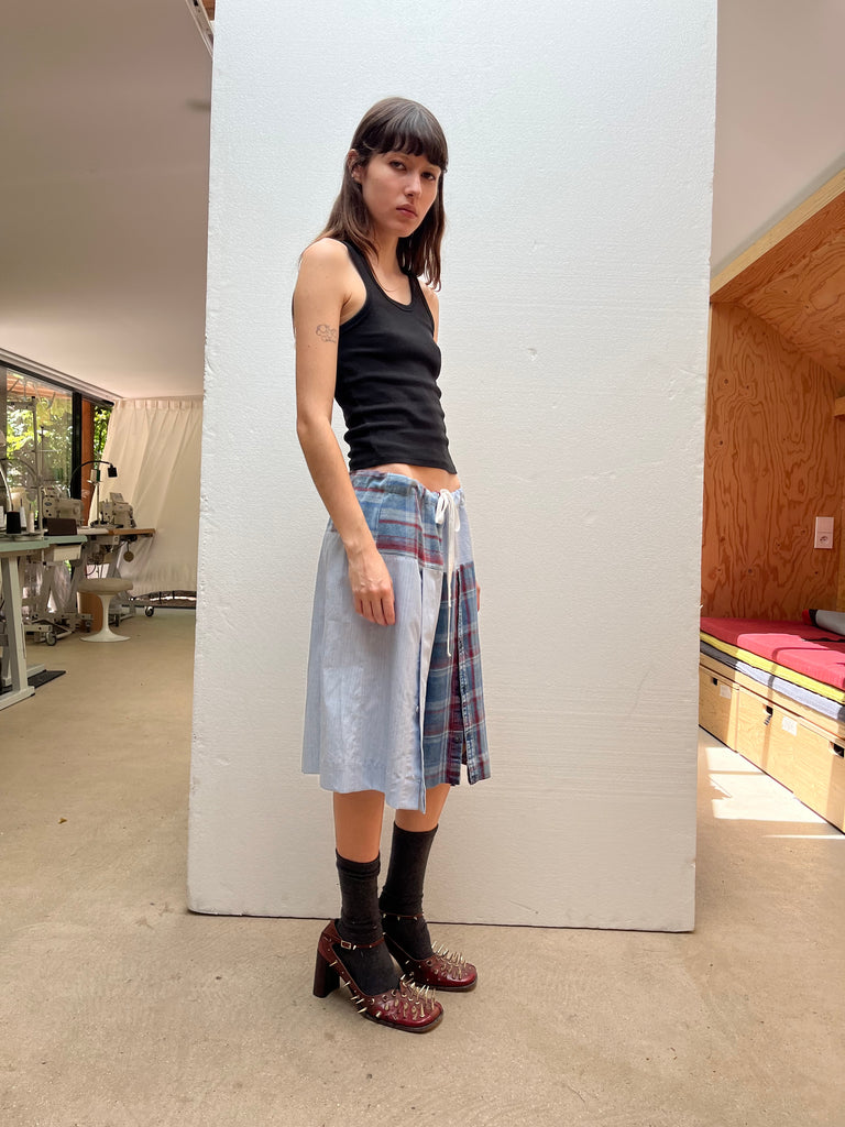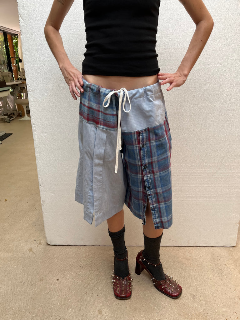 100% cotton shorts made from vintage shirts featuring a working button front and tie on waist for adjustable size. Unisex size S