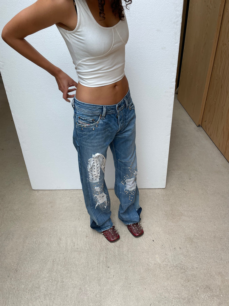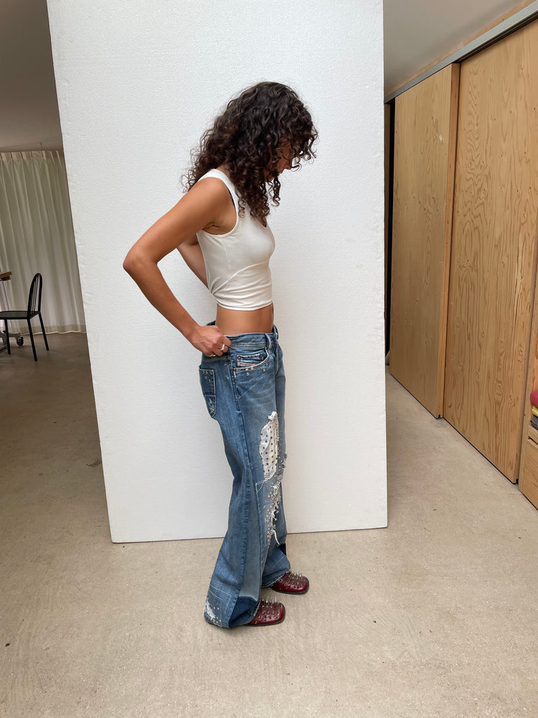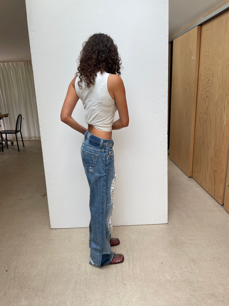 One of one up-cycled studded jeans with distressed details and star silk inserts. Unisex