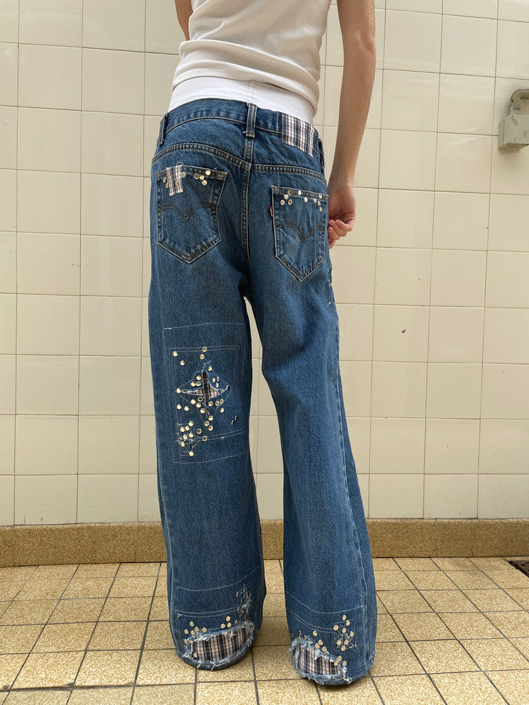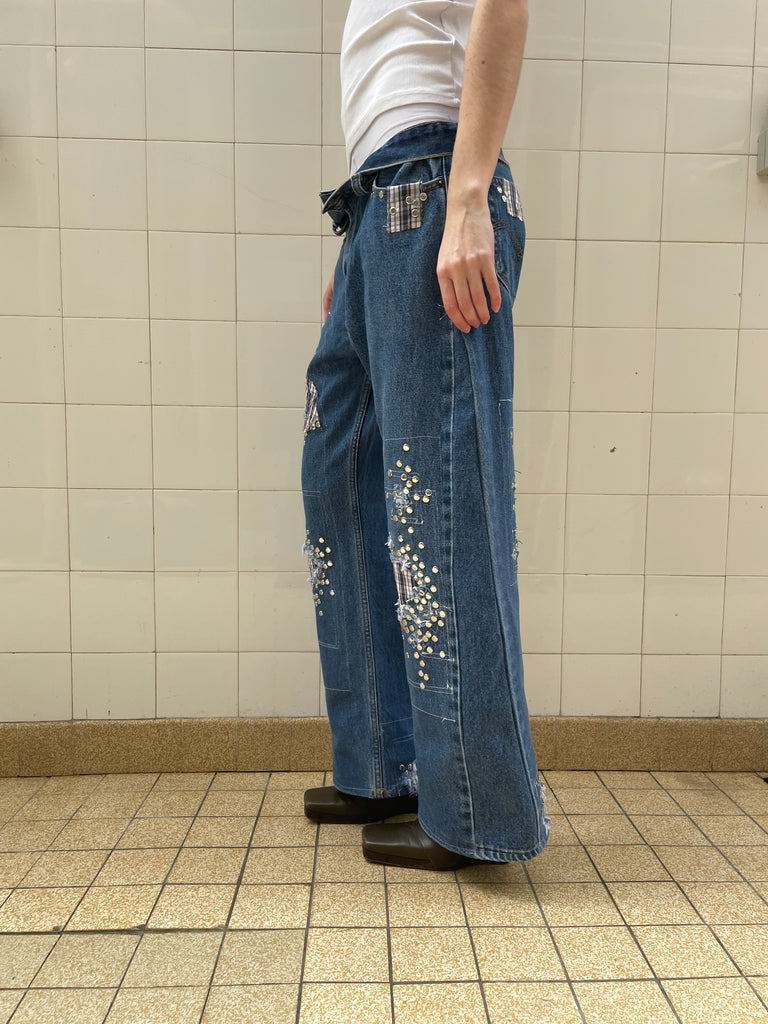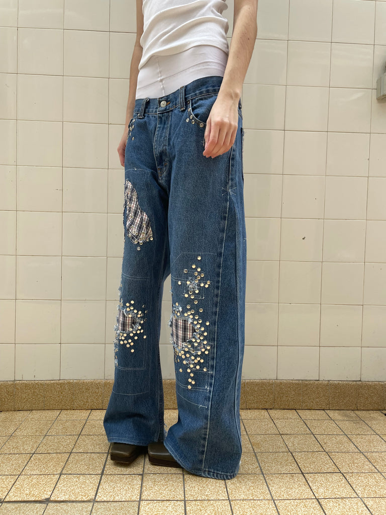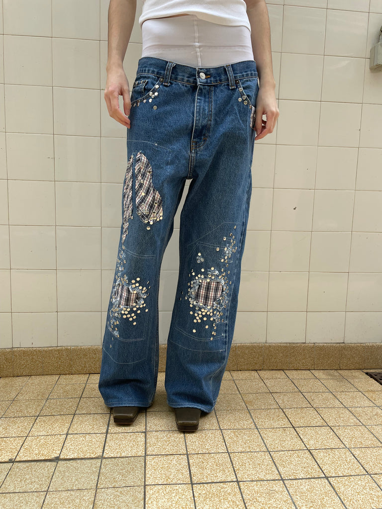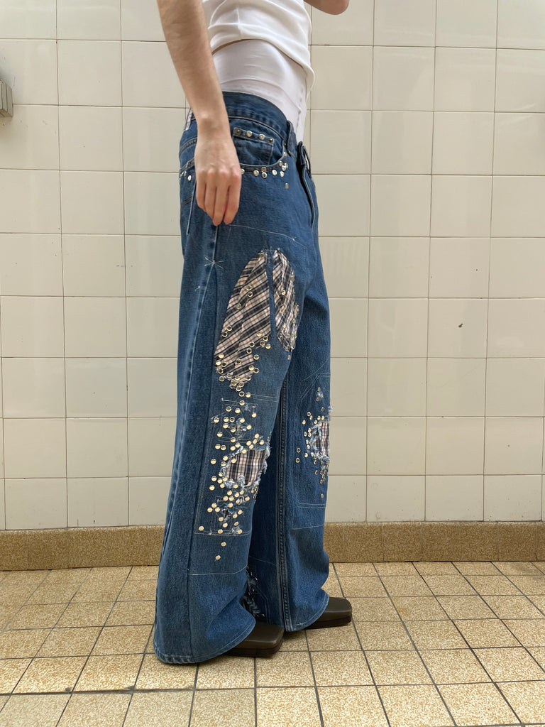 One of one Up-cycled vintage denim jeans with cotton shirt plaid patches, distressed knees and studs on front and back. With vintage cotton shirt lining on the inside. Designed and made in Paris.