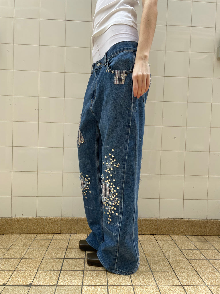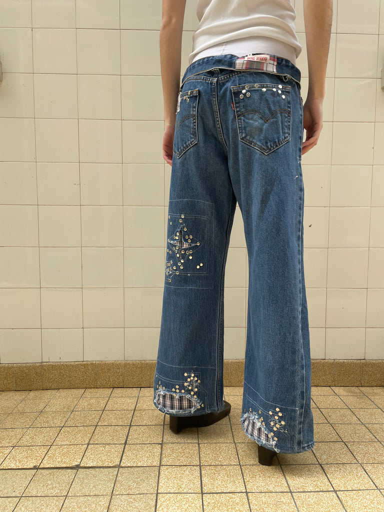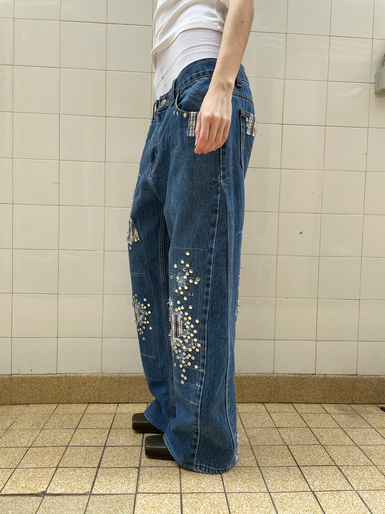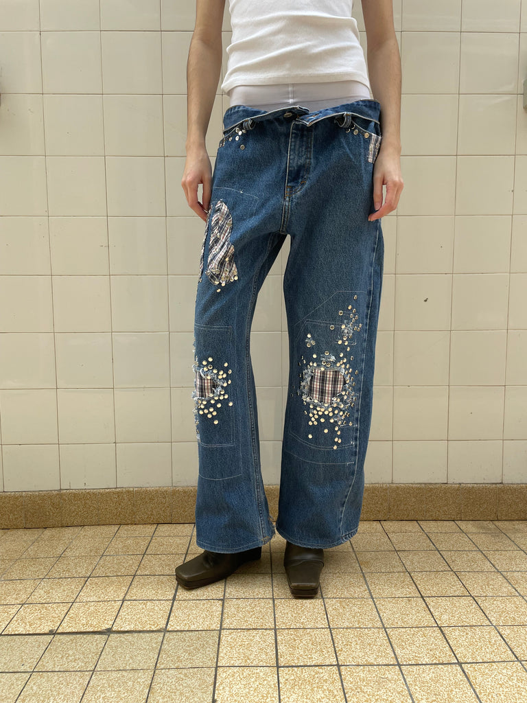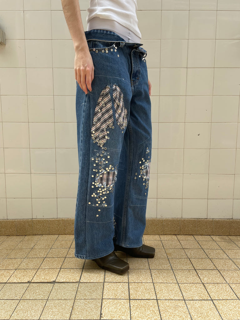 One of one Up-cycled vintage denim jeans with cotton shirt plaid patches, distressed knees and studs on front and back. With vintage cotton shirt lining on the inside. Designed and made in Paris.