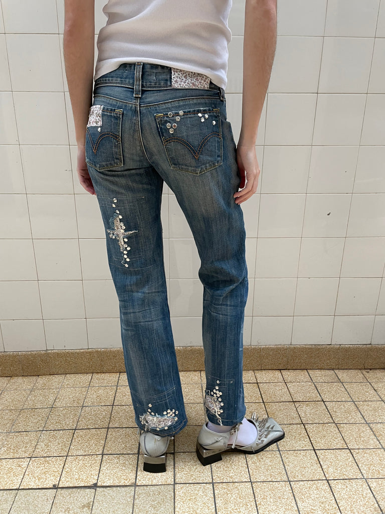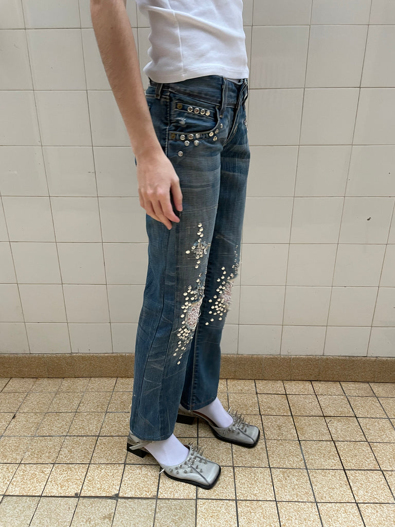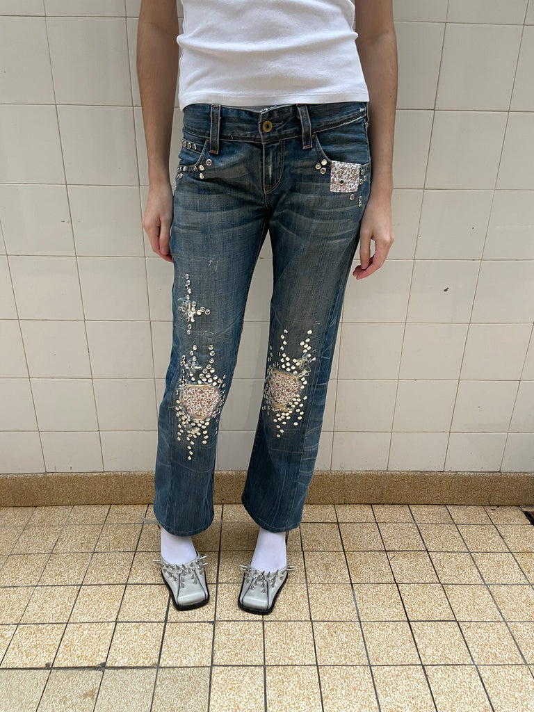 One of one up-cycled studded jeans with distressed details and vintage floral print cotton inserts.