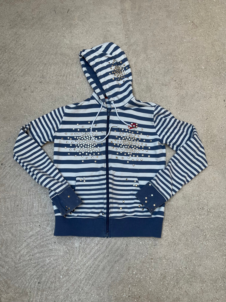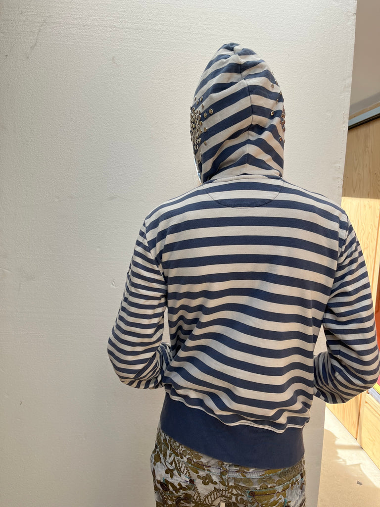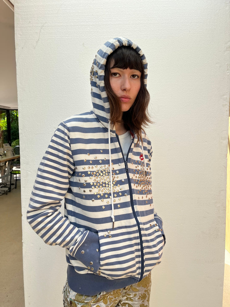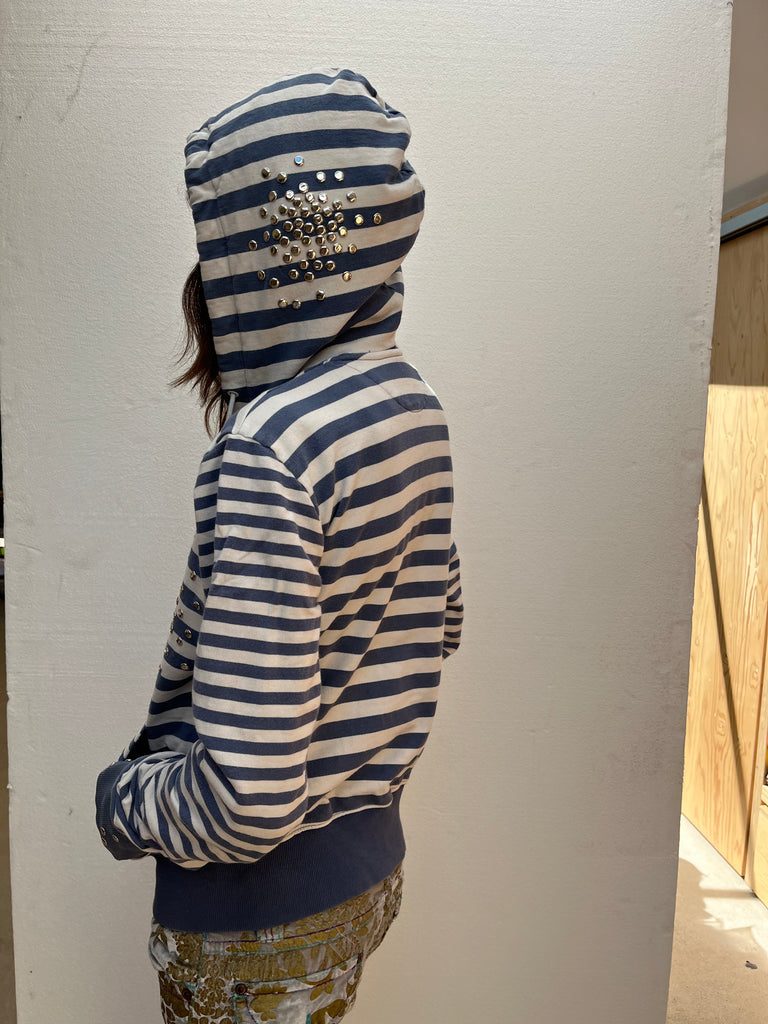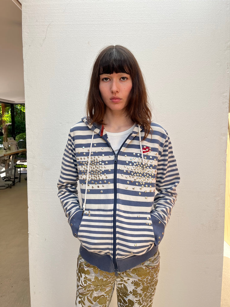 One of one studded cotton jersey hoodie with zip up front and lining. Featuring striped print.