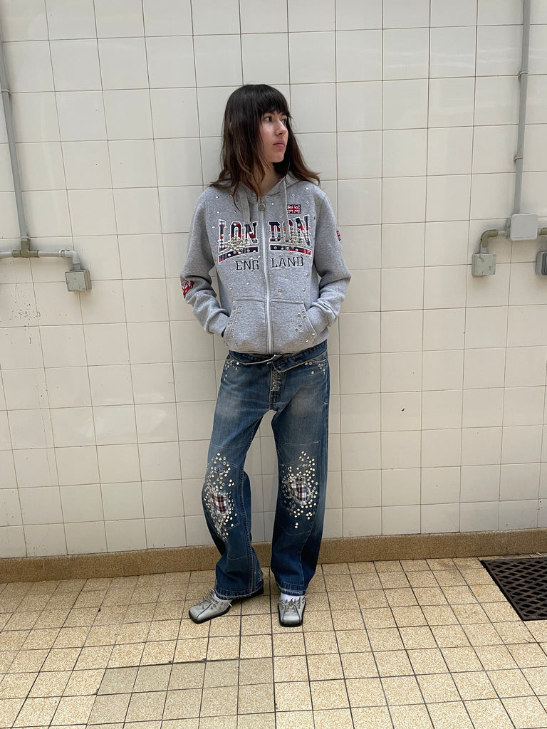 light grey vintage hoodie, with stud details and a lining. Size S