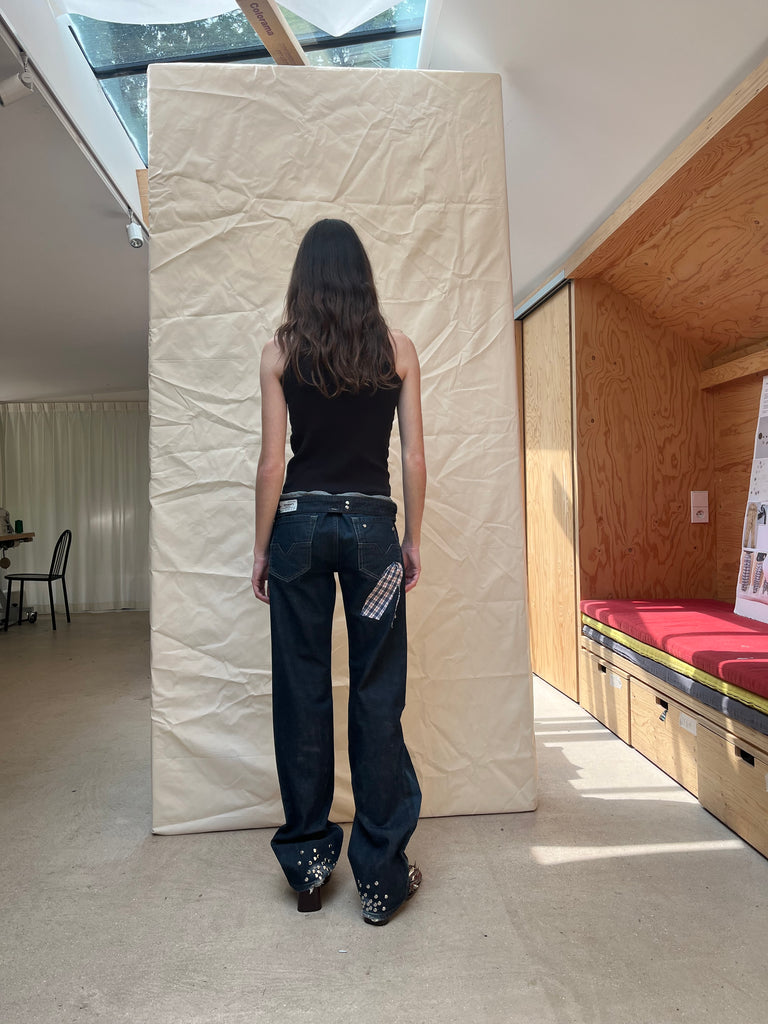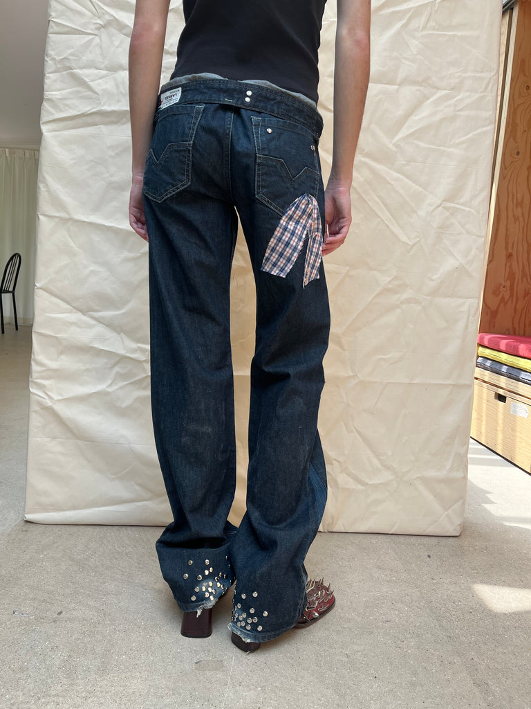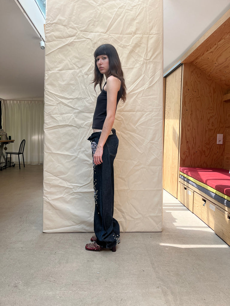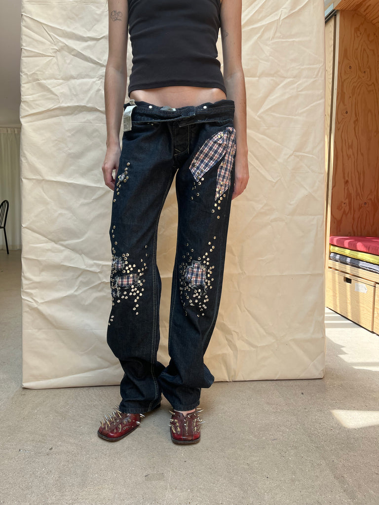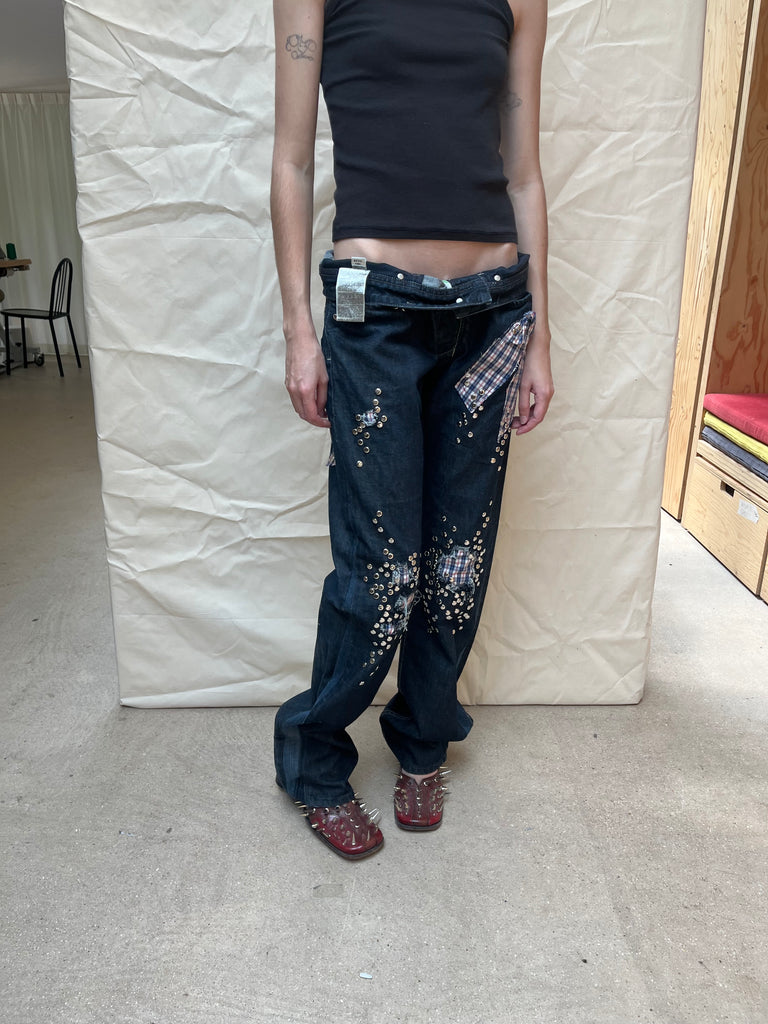One of one up-cycled studded jeans with cotton shirt inlay. Crafted in Paris