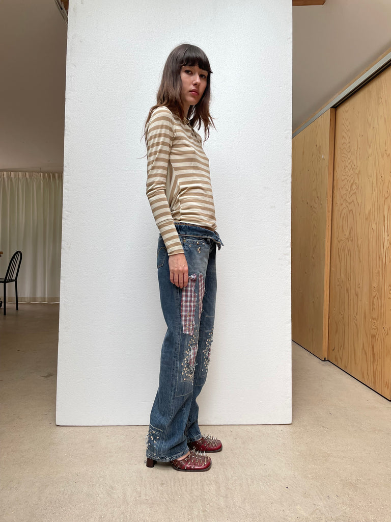 One of one up-cycled studded jeans with distressed details and plaid cotton shirt inserts. Unisex