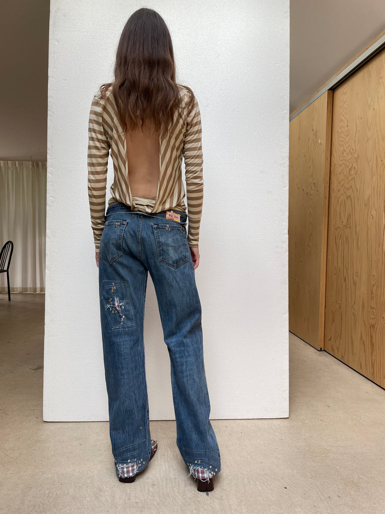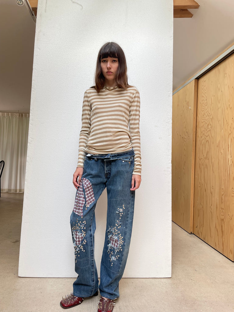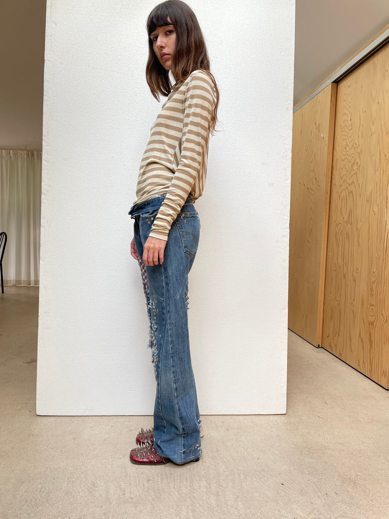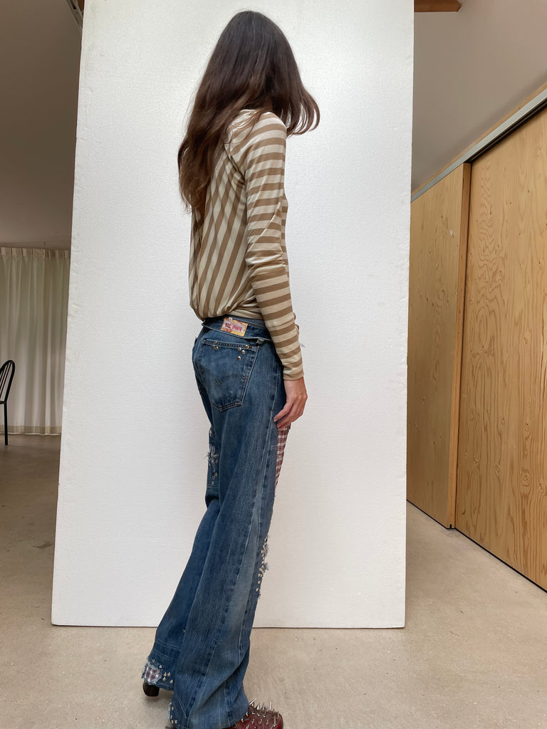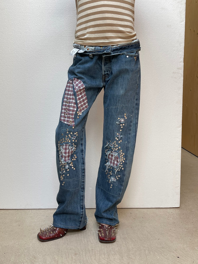One of one up-cycled studded jeans with distressed details and plaid cotton shirt inserts. Unisex