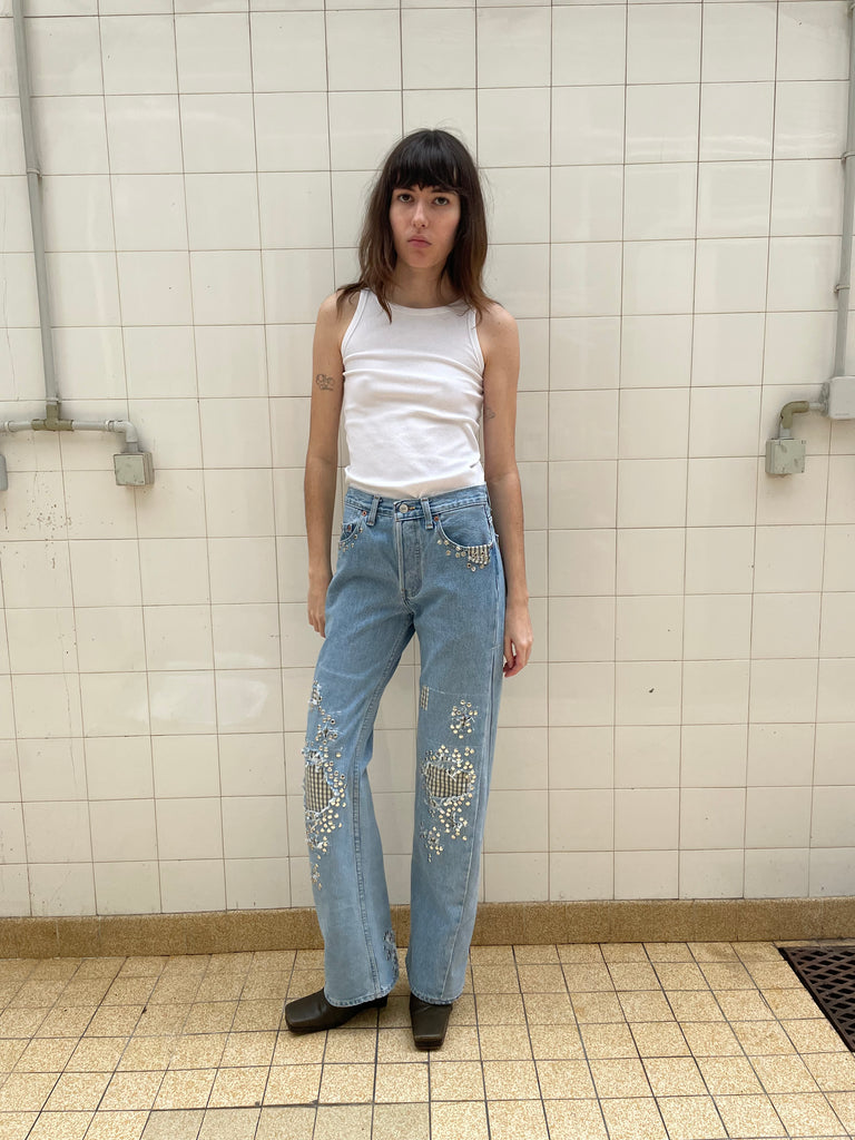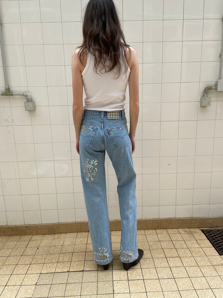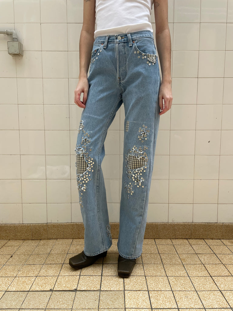 One of one Up-cycled vintage denim jeans with cotton plaid shirt patches, distressed knees and studs on front and back. With vintage cotton shirt lining on the inside. Designed and made in Paris.