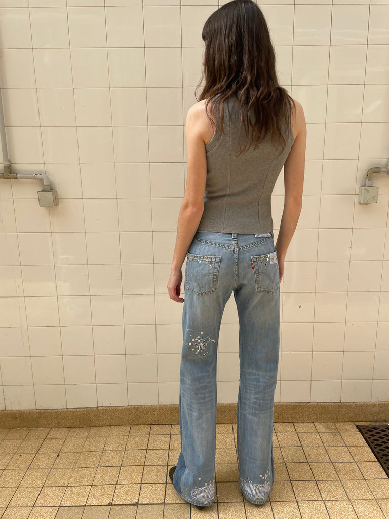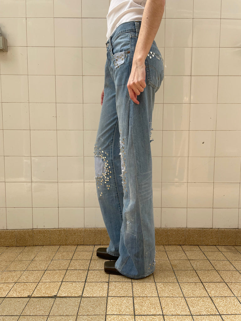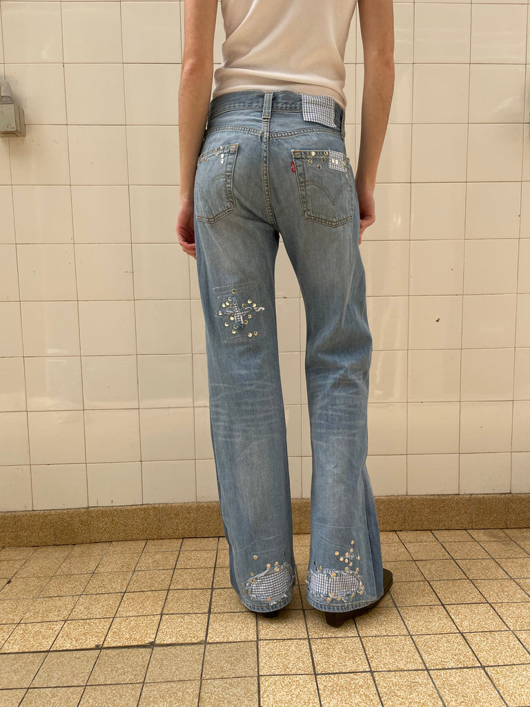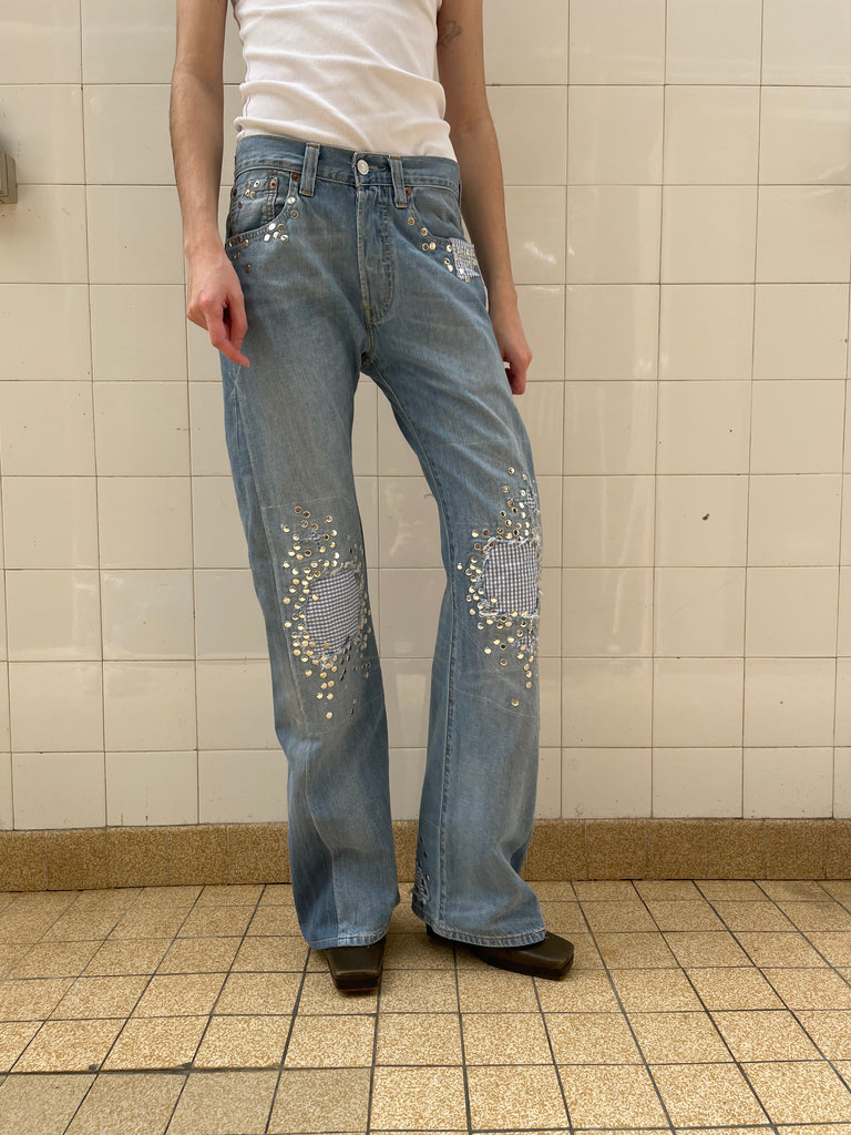One of one Up-cycled vintage denim jeans with cotton shirt plaid patches, distressed knees and studs on front and back. With vintage cotton shirt lining on the inside. Designed and made in Paris.