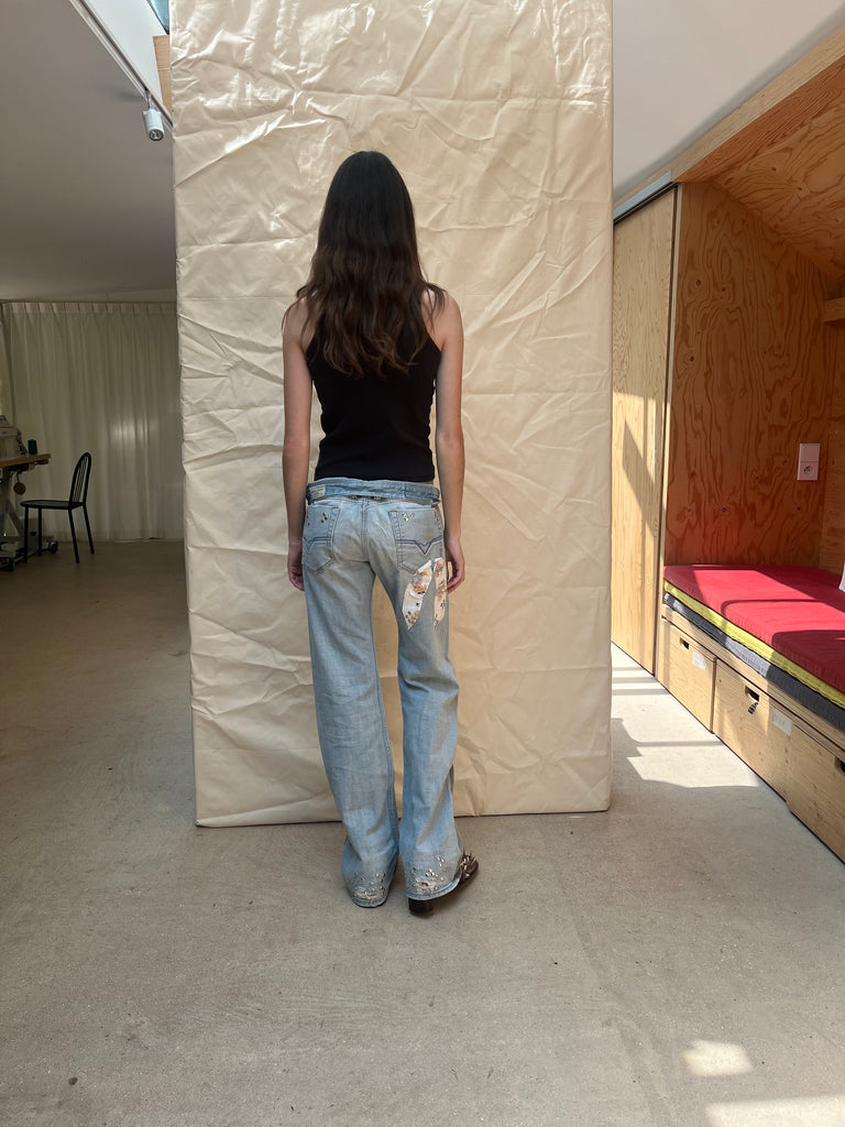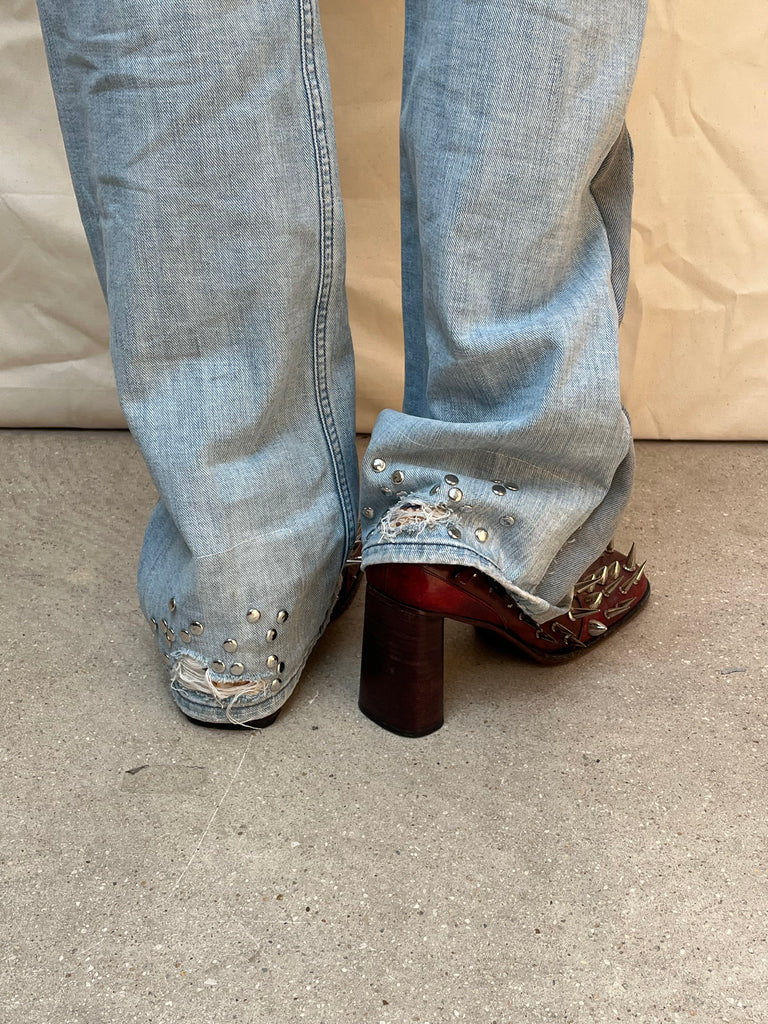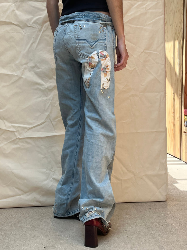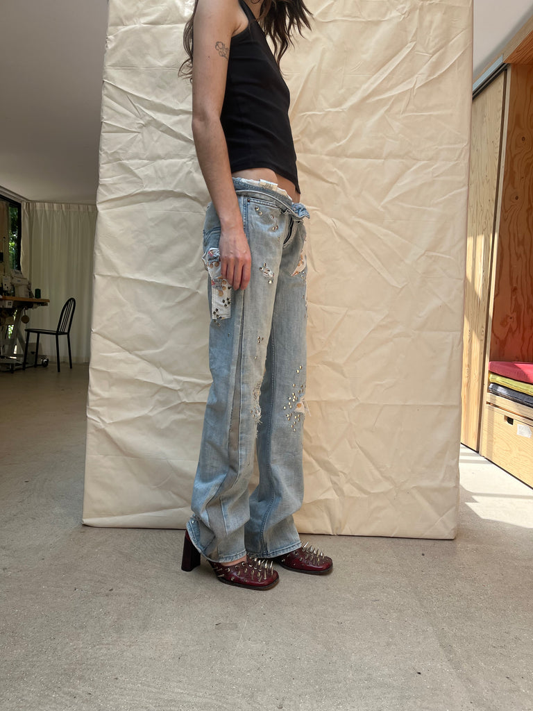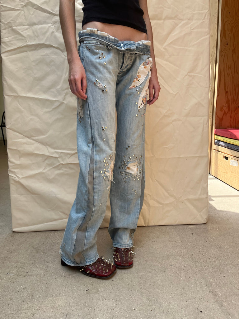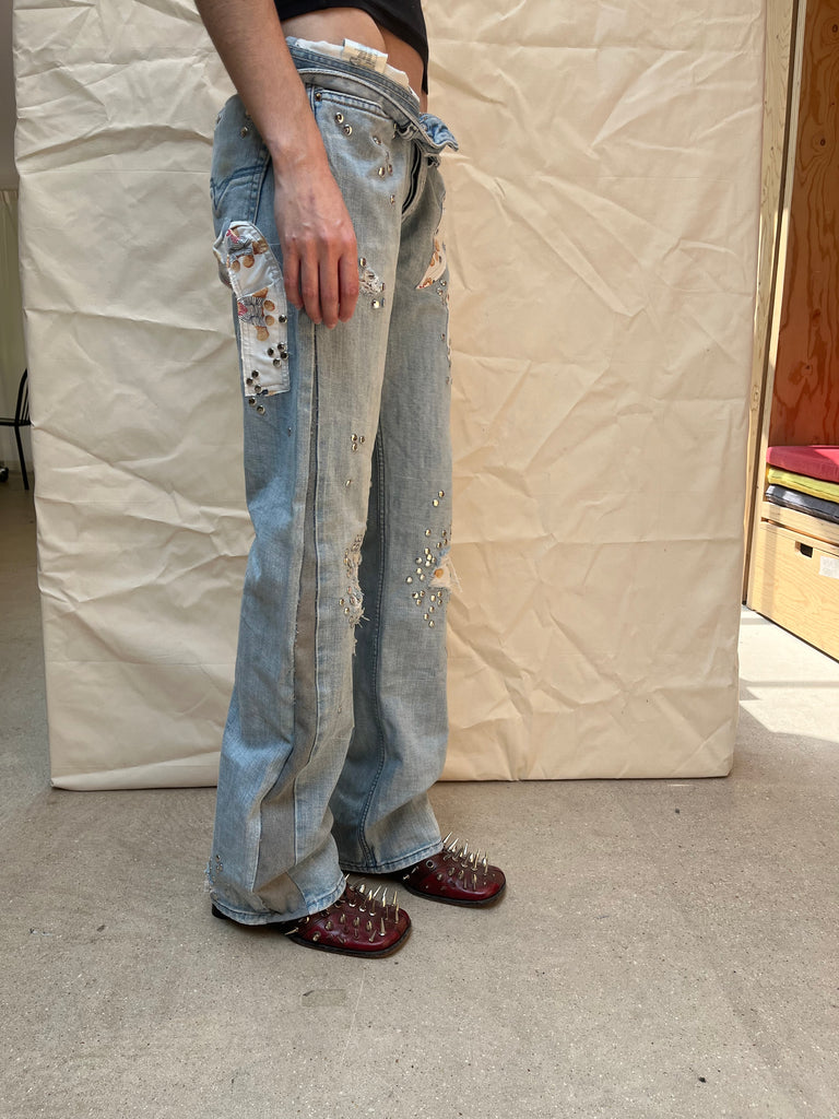 One of one up-cycled studded jeans with teddy bear shirt inlay. Crafted in Paris