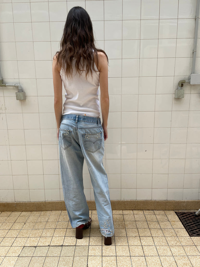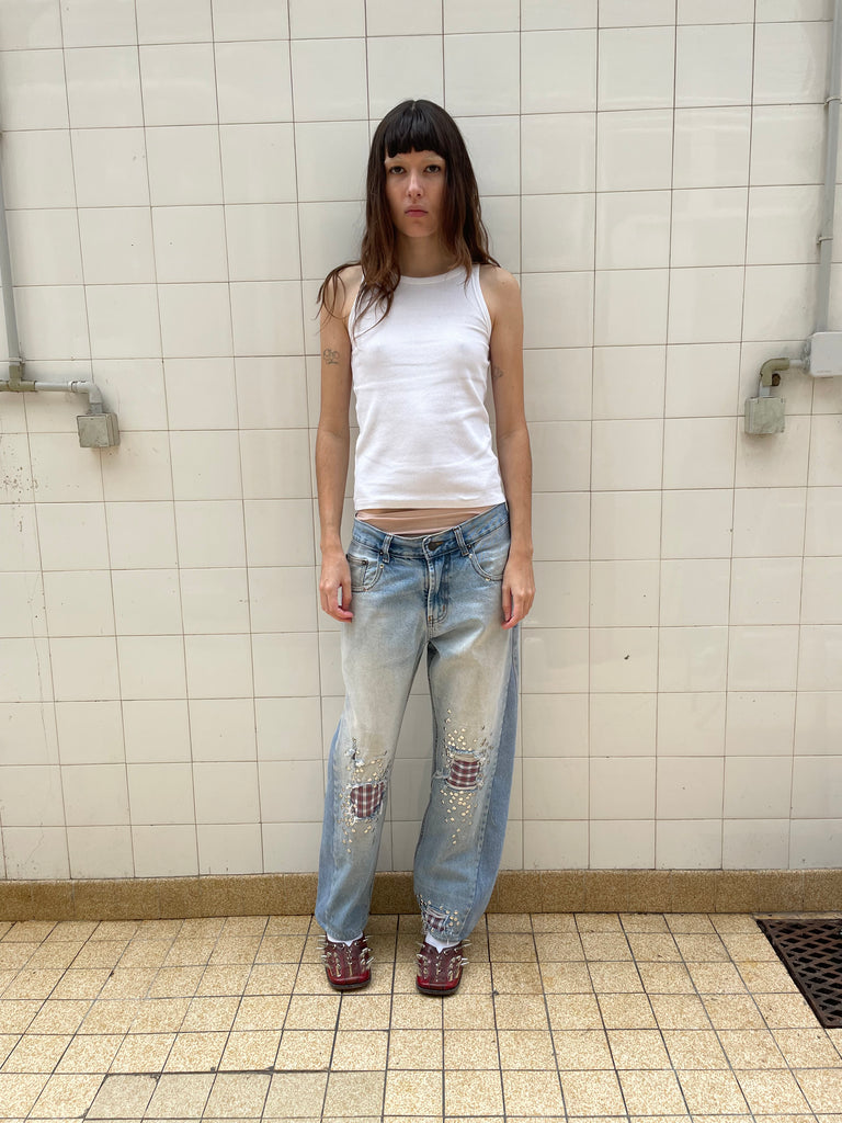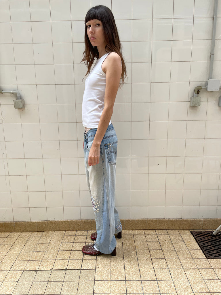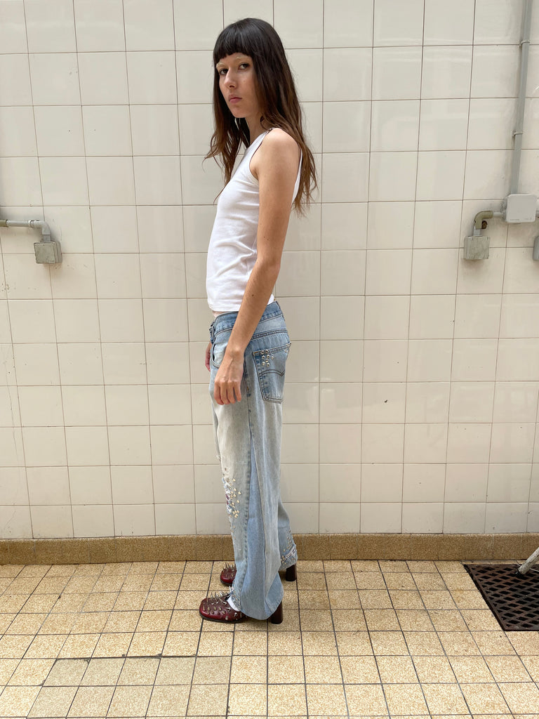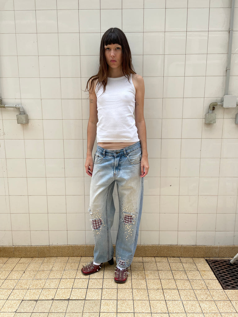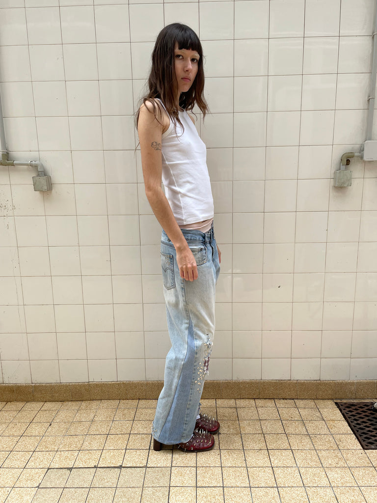 one of one up-cycled studded jeans with distressed details and vintage cotton shirt inserts. Unisex (men’s base jean)