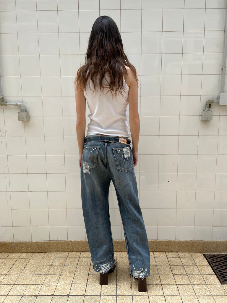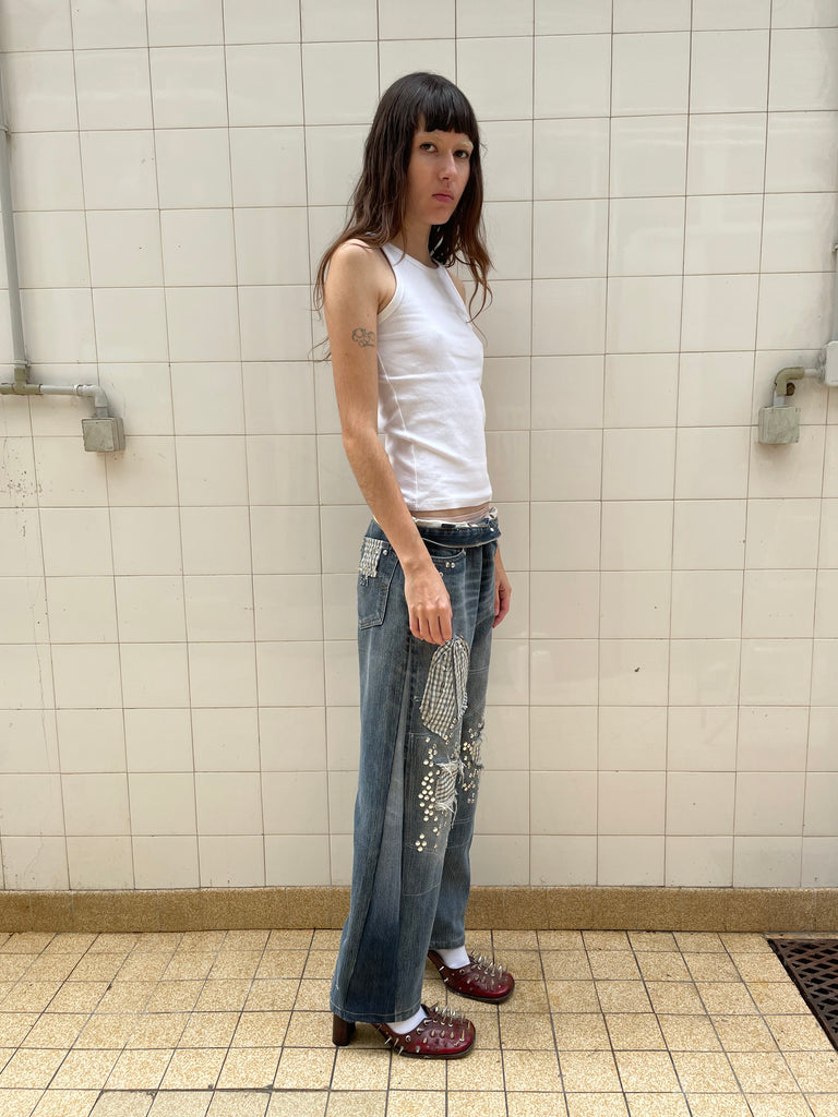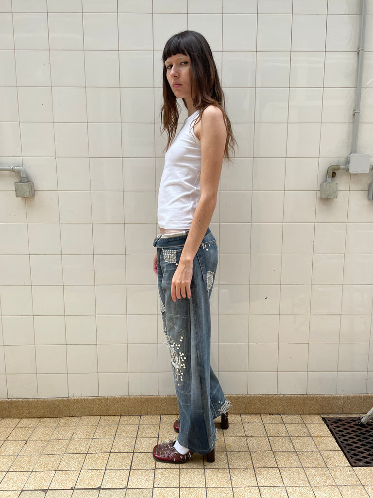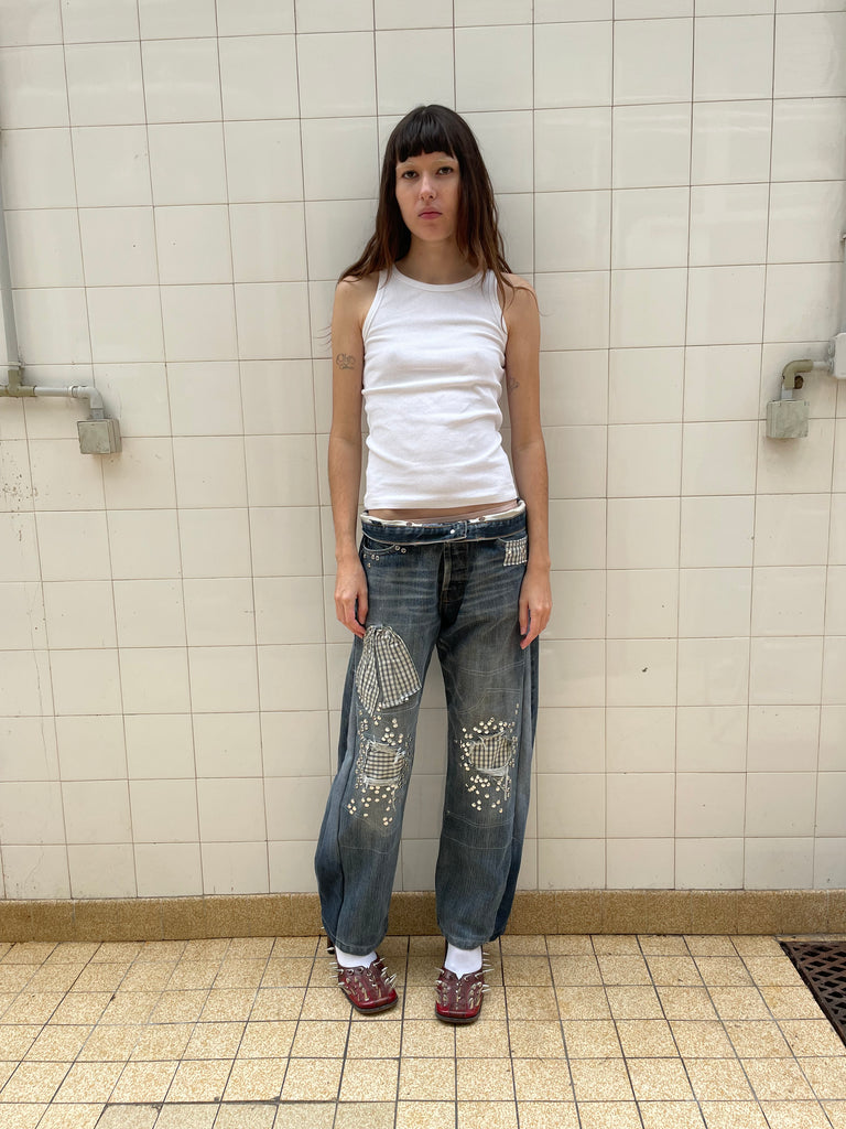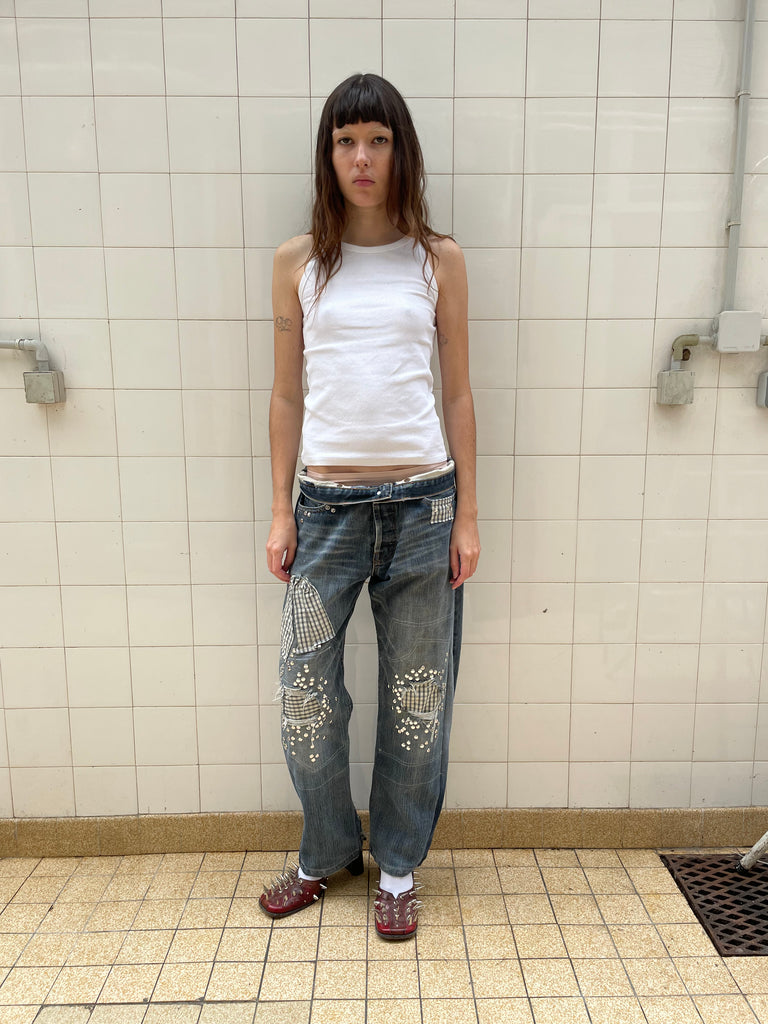 one of one up-cycled studded jeans with distressed details and vintage cotton shirt inserts. Unisex