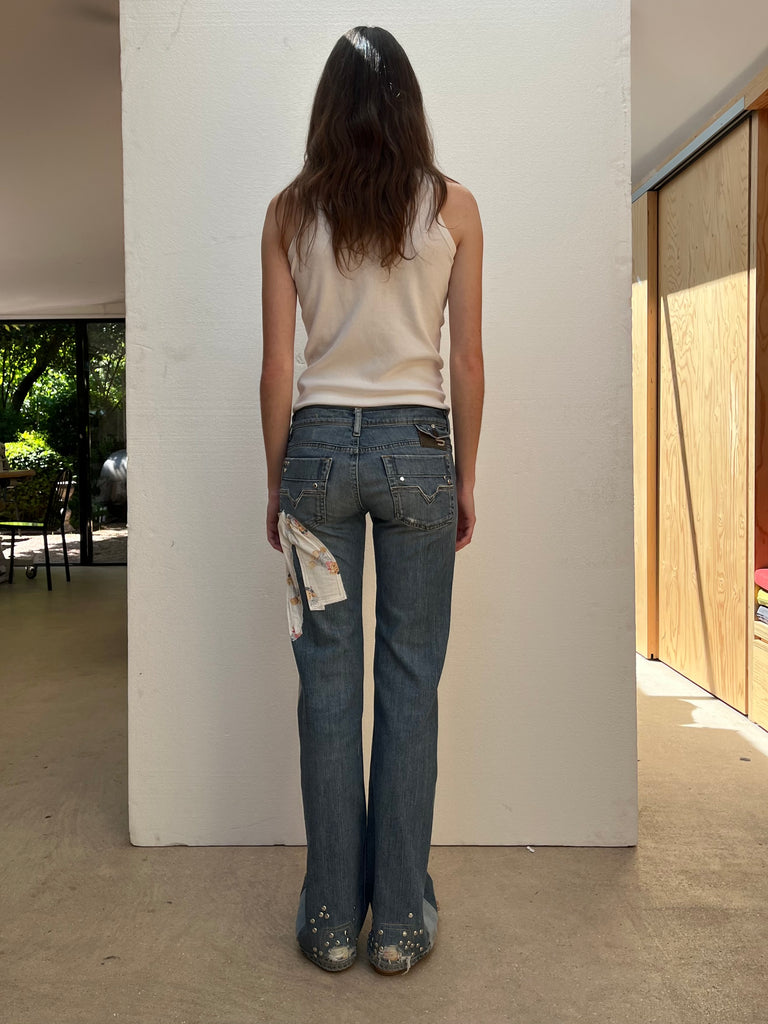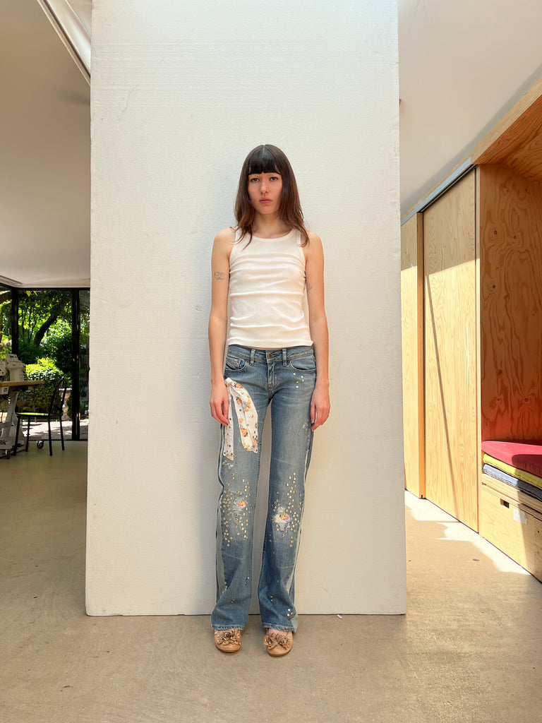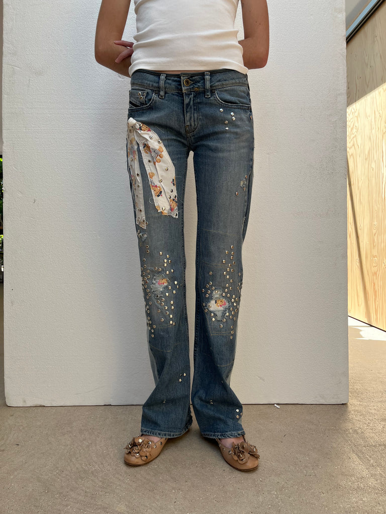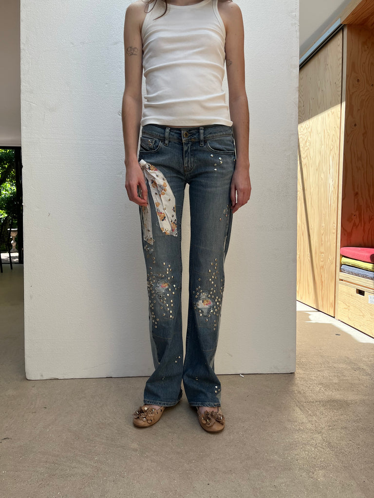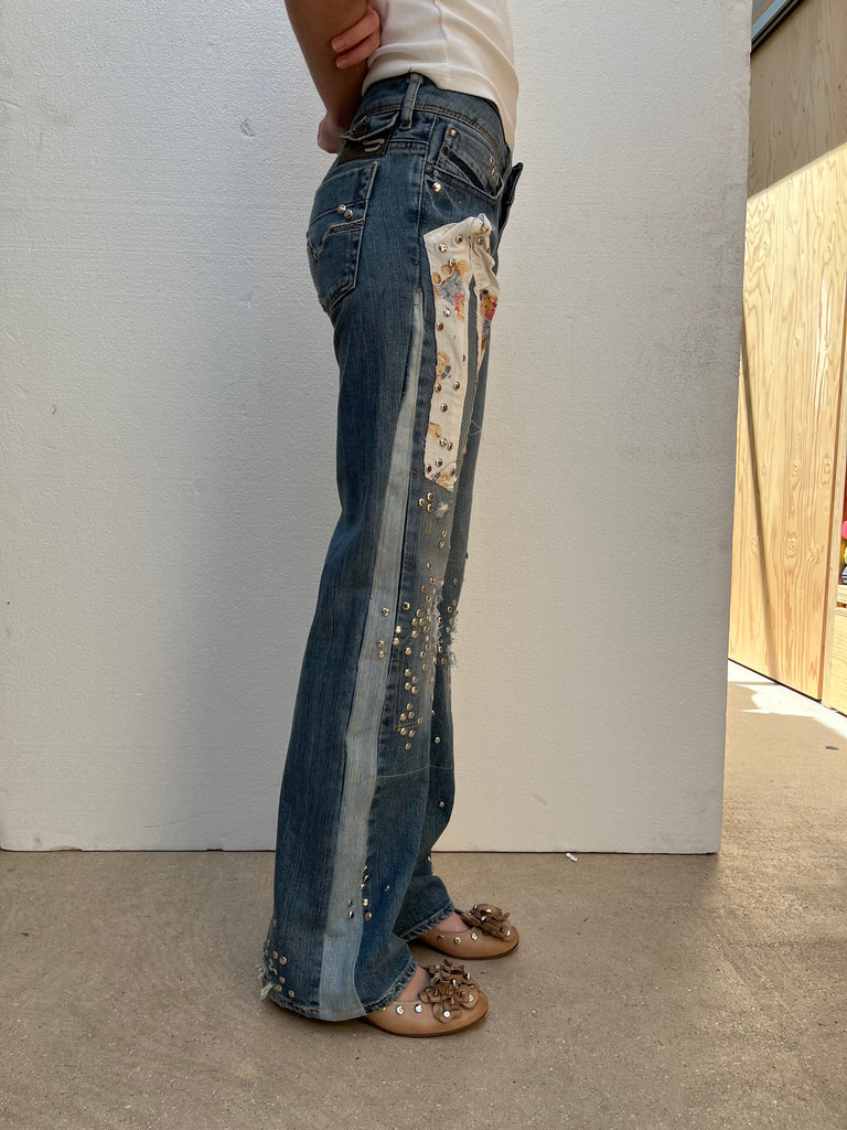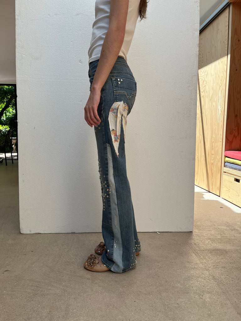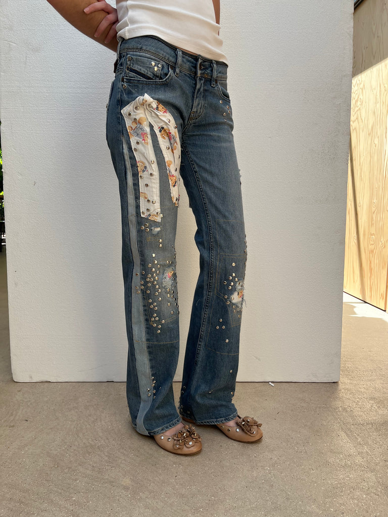 Studded jeans with cotton teddy print bows and added side panel. Sourced and up-cycled in Paris