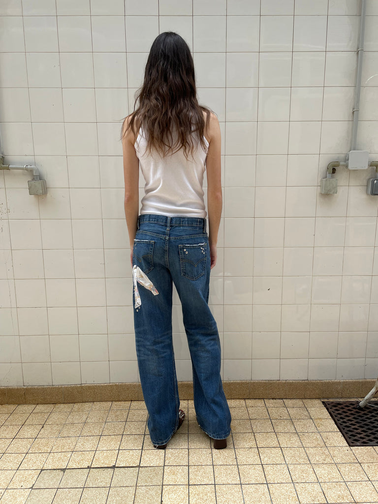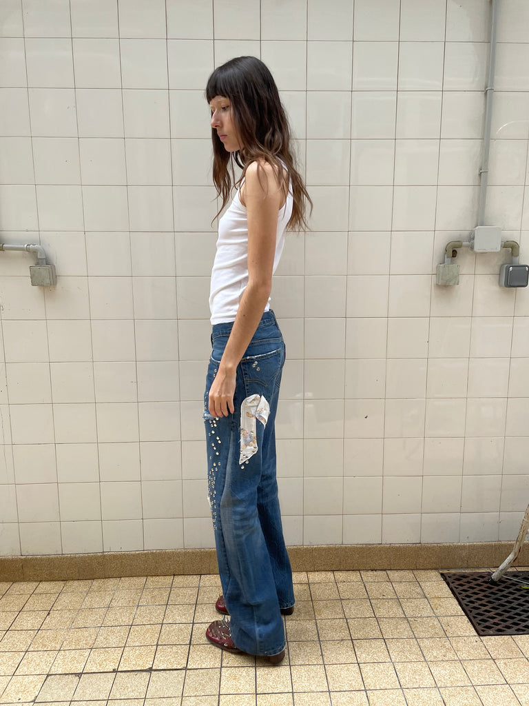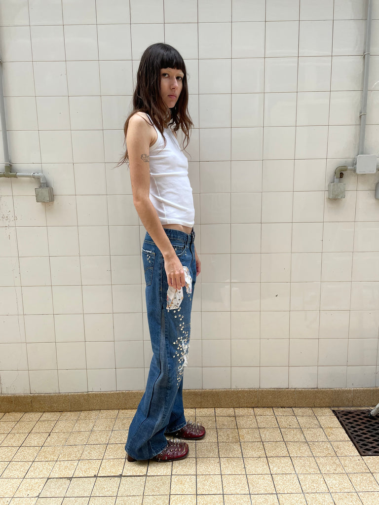 One of one up-cycled studded jeans with distressed details and plaid cotton shirt inserts. Unisex