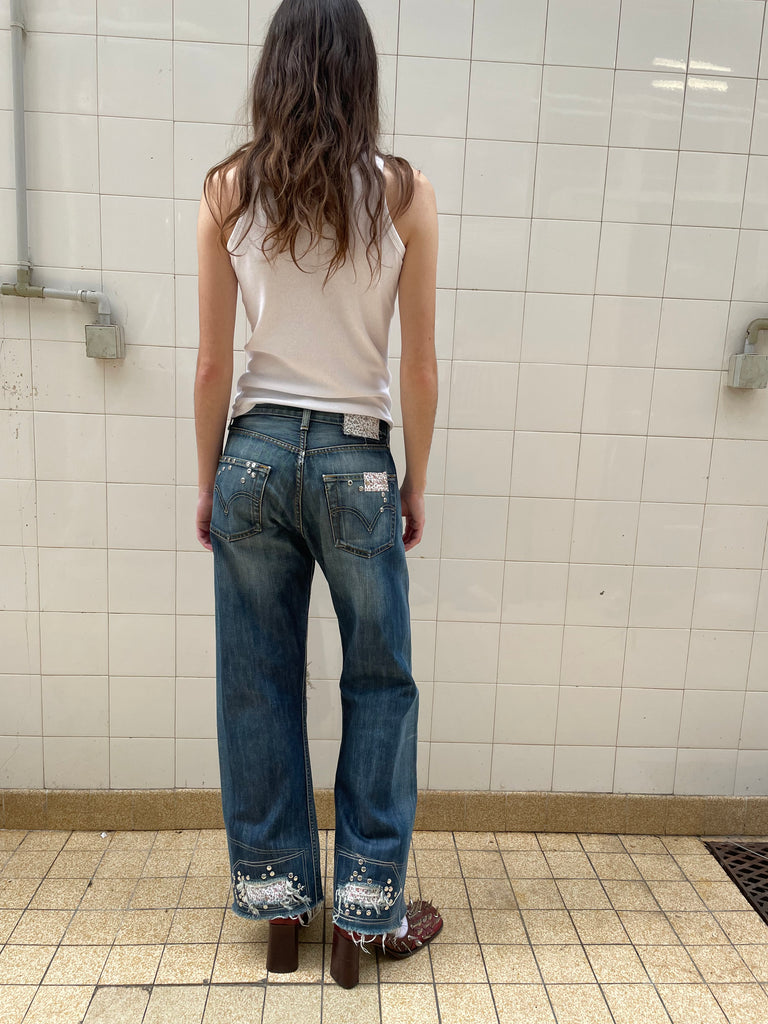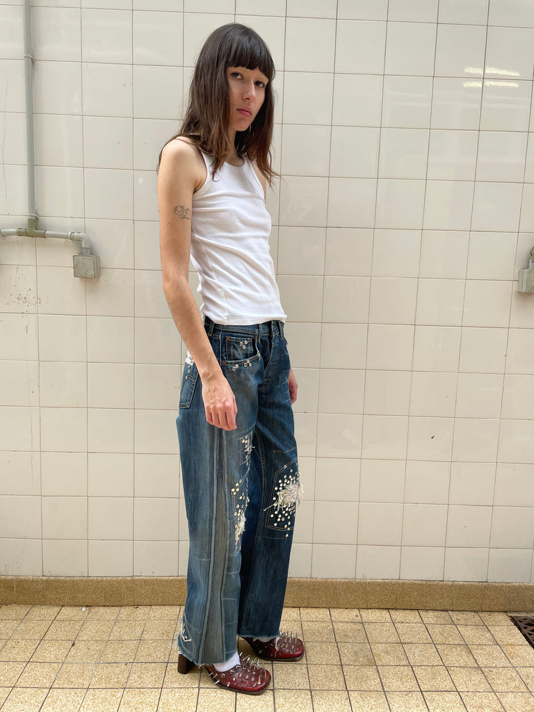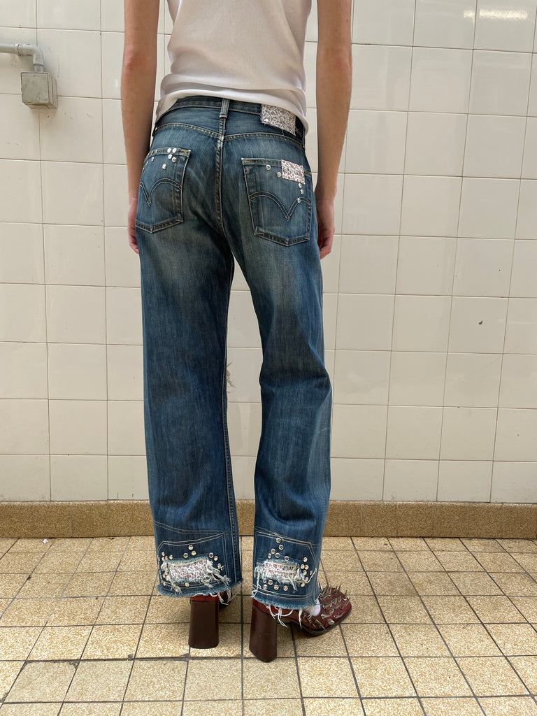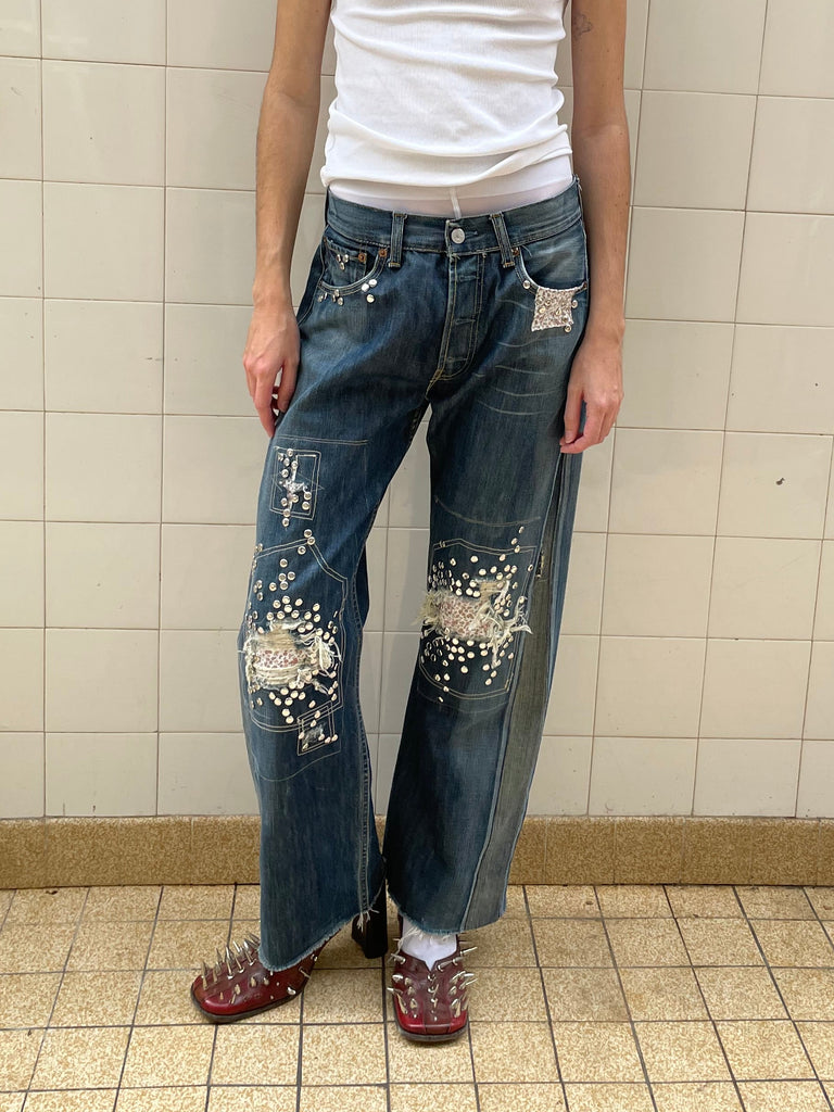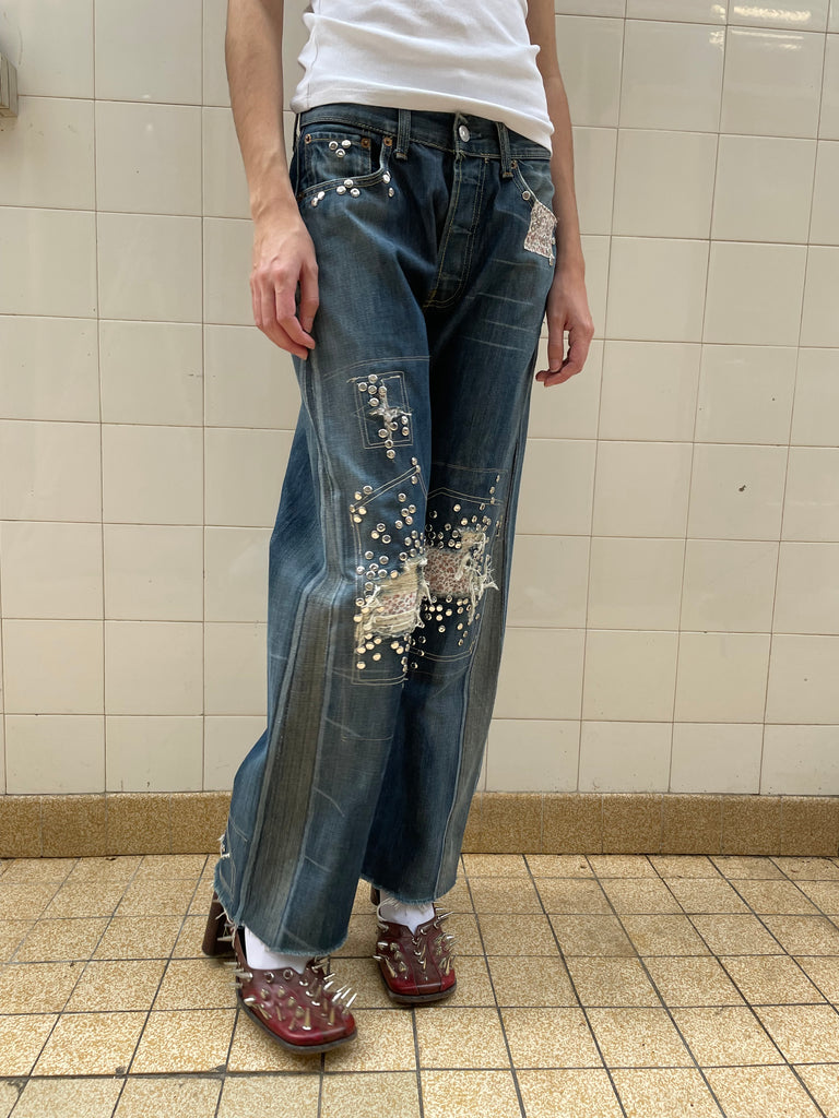 One of one up-cycled studded jeans with distressed details and floral print inserts. Unisex