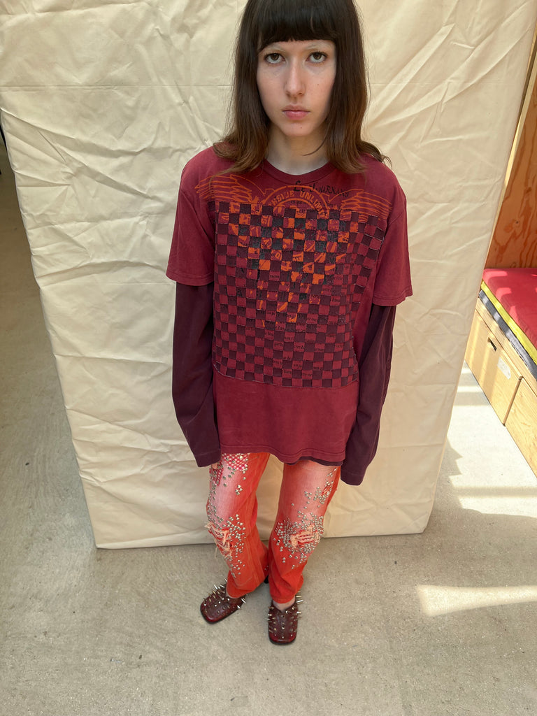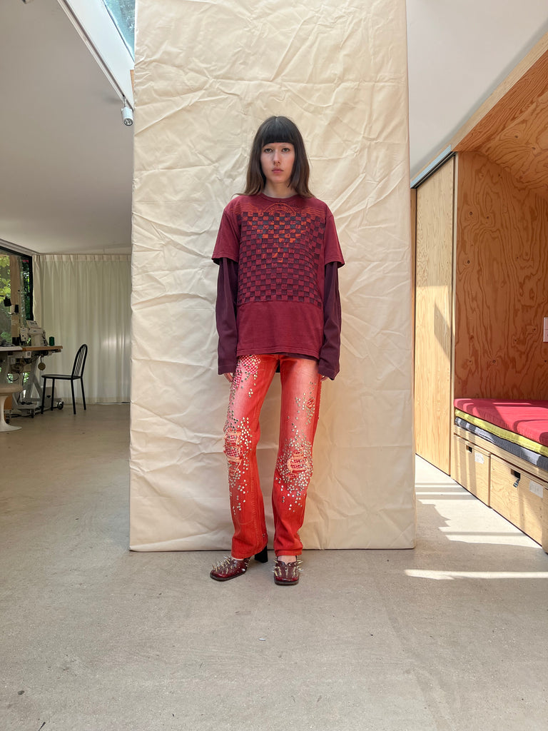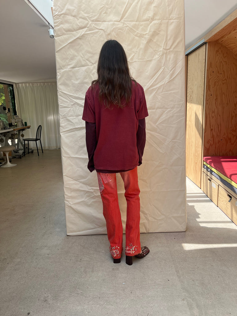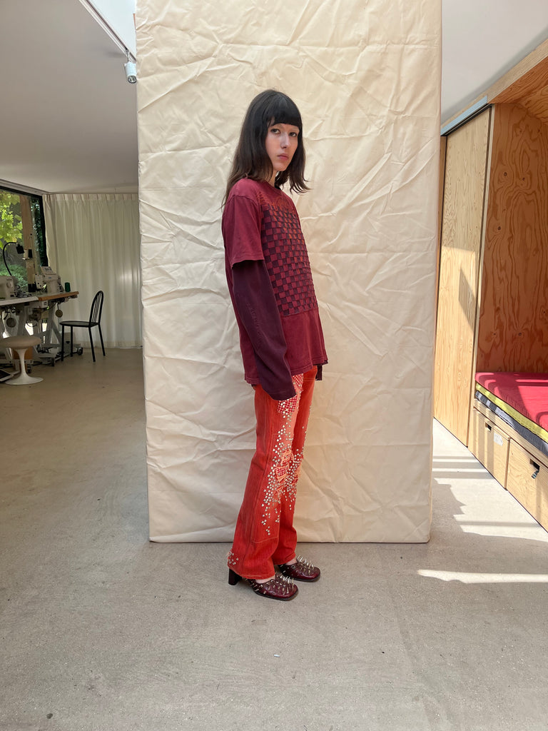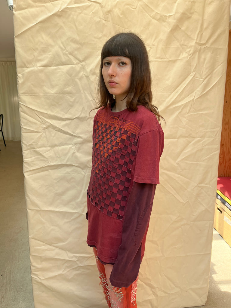 Burgundy red one of one up-cycled woven T-shirt. Crafted in Paris.